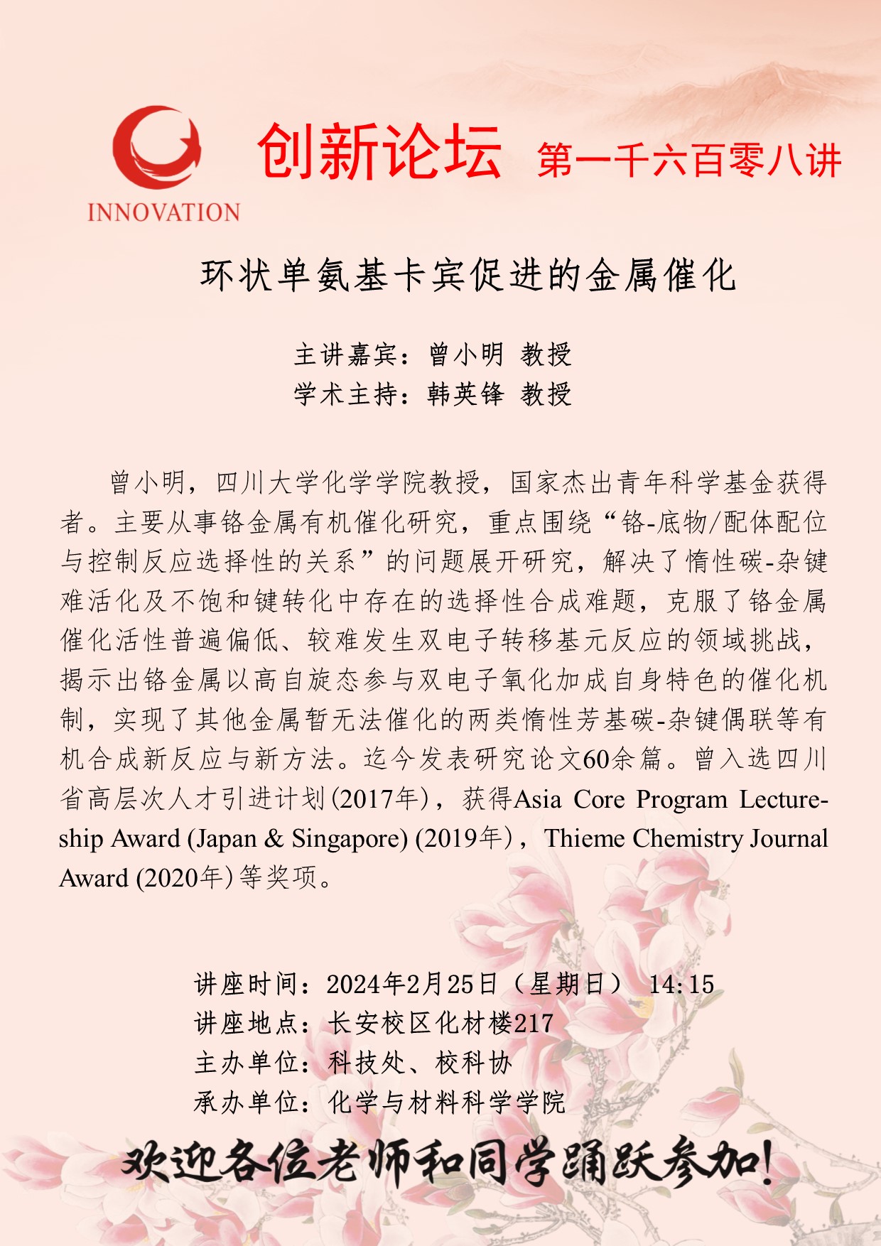 曾小明 教授 开云手机网页版登录入口创新论坛第一千六百零八讲: 环状单氨基卡宾促进的金属催化 讲座时间 2024年2月25日(星期日) 14:15 讲座地点 长安校区化材楼217 讲座人介绍 曾小明 教授 讲座内容