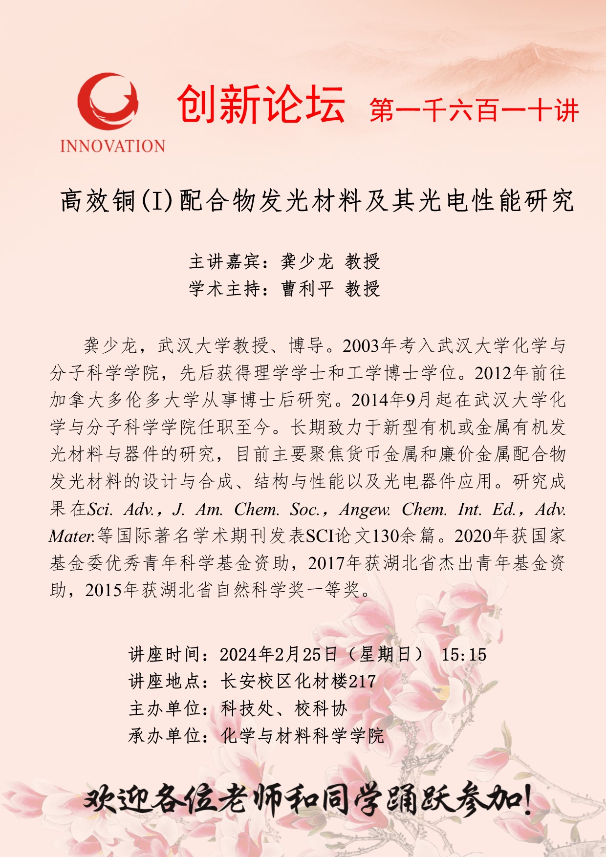 龚少龙 教授 开云手机网页版登录入口创新论坛第一千六百一十讲:高效铜(I)配合物发光材料及其光电性能研究 讲座时间 2024年2月25日(星期日) 15:15 讲座地点 长安校区化材楼217 讲座人介绍 龚少龙 教授 讲座内容