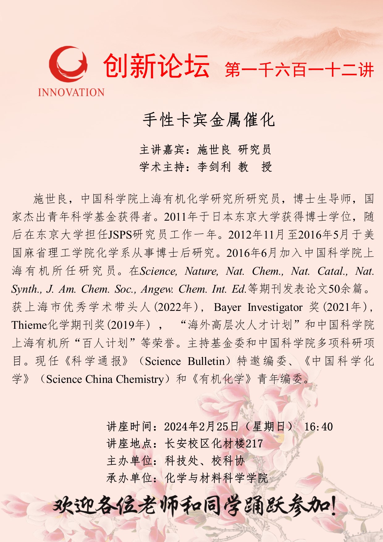施世良 研究员 开云手机网页版登录入口创新论坛第一千六百一十二讲:手性卡宾金属催化 讲座时间 2024年2月25日(星期日) 16:40 讲座地点 长安校区化材楼217 讲座人介绍 施世良 研究员 讲座内容