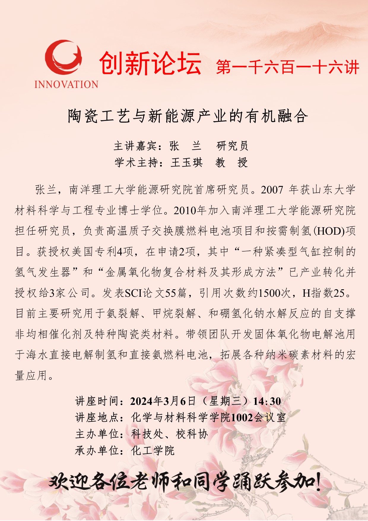 张兰 研究员 开云手机网页版登录入口创新论坛第一千六百一十六讲:陶瓷工艺与新能源产业的有机融合 讲座时间 2024年3月6日(星期三)14:30 讲座地点 化学与材料科学学院1002会议室 讲座人介绍 张兰 研究员 讲座内容