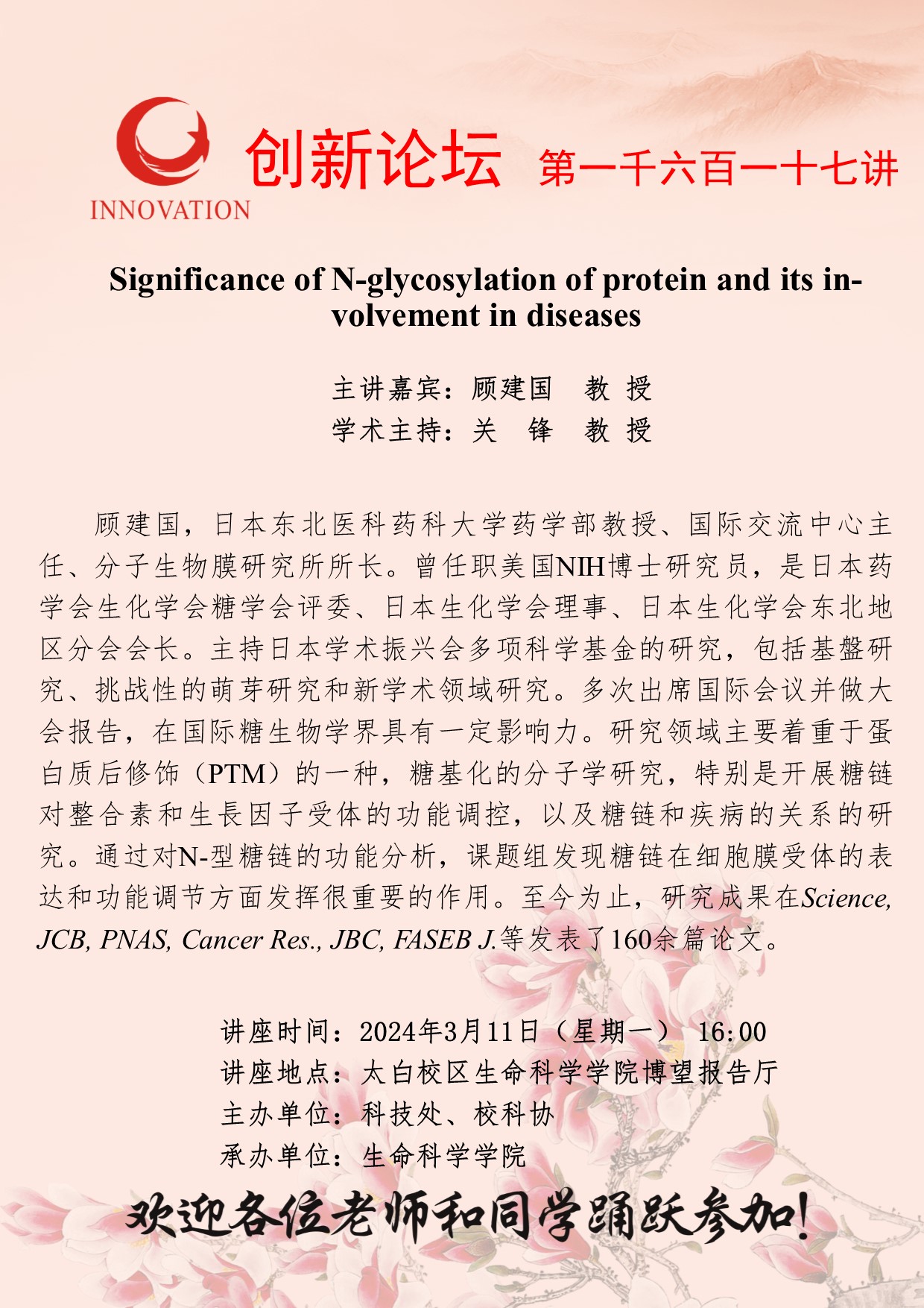 顾建国 教授 开云手机网页版登录入口创新论坛第一千六百一十七讲:Significance of N-glycosylation of protein and its involvement in diseases 讲座时间 2024年3月11日(星期一) 16:00 讲座地点 太白校区生命科学学院博望报告厅 讲座人介绍 顾建国 教授 讲座内容