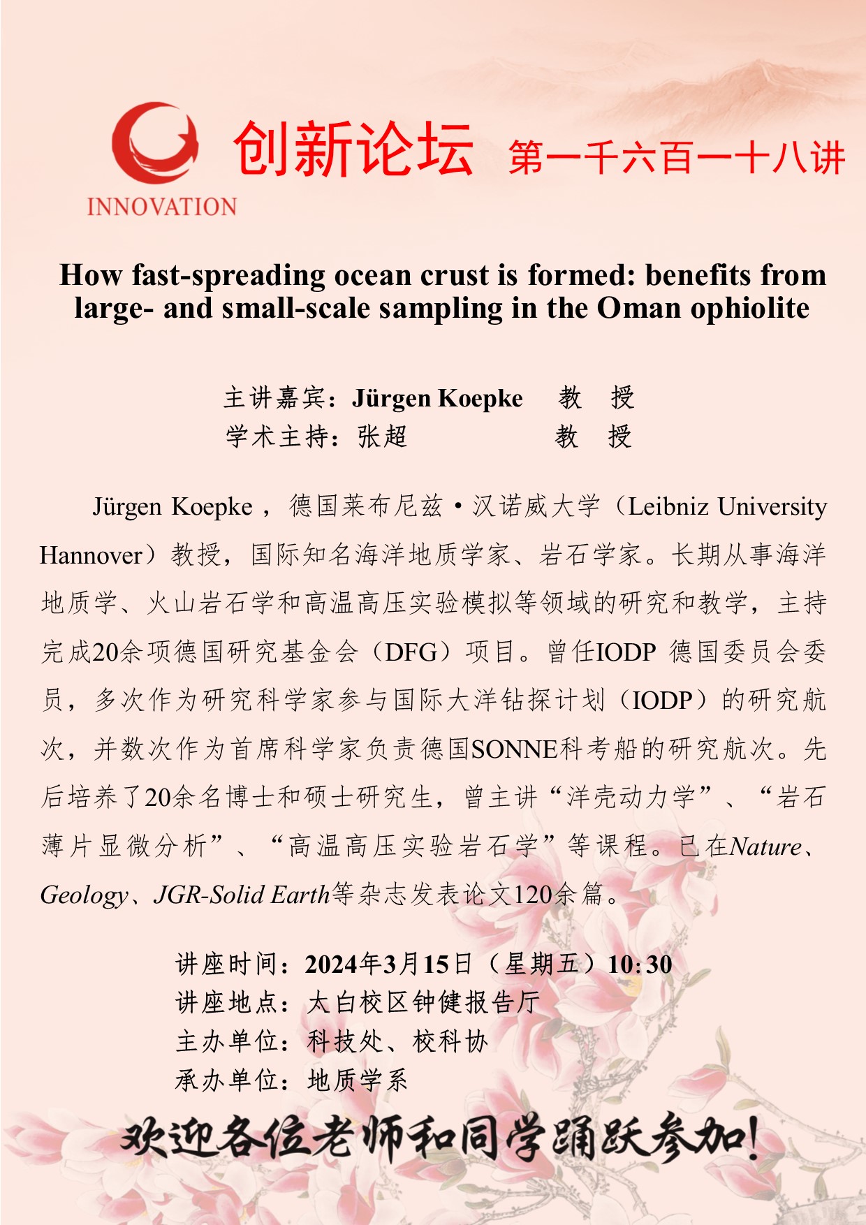 Jürgen Koepke 教 授 开云手机网页版登录入口创新论坛第一千六百一十八讲:How fast-spreading ocean crust is formed: benefits from large- and small-scale sampling in the Oman ophiolite 讲座时间 2024年3月15日(星期五)10:30 讲座地点 太白校区钟健报告厅 讲座人介绍 Jürgen Koepke 教 授 讲座内容