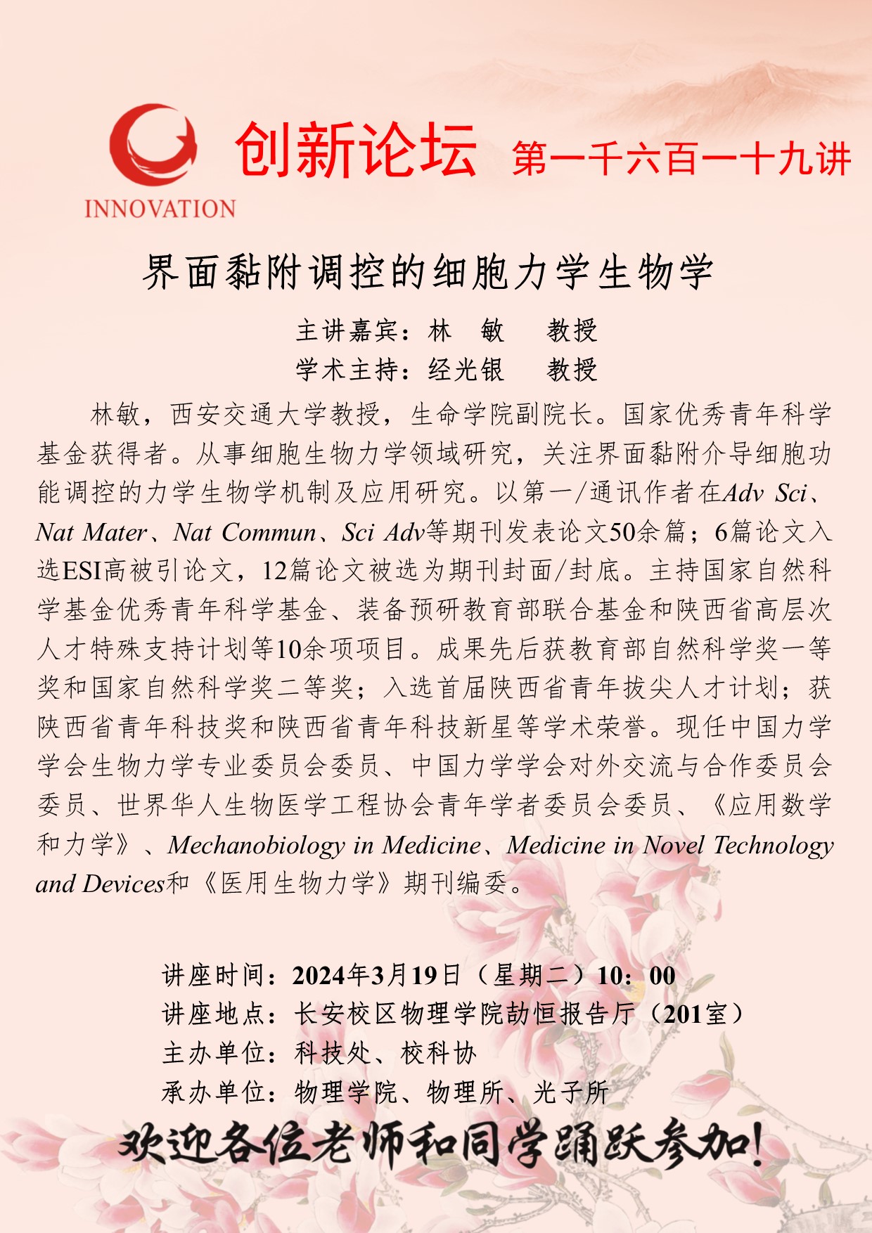林敏 教授 开云手机网页版登录入口创新论坛第一千六百一十九讲:界面黏附调控的细胞力学生物学 讲座时间 2024年3月19日(星期二)10:00 讲座地点 长安校区物理学院劼恒报告厅(201室) 讲座人介绍 林敏 教授 讲座内容