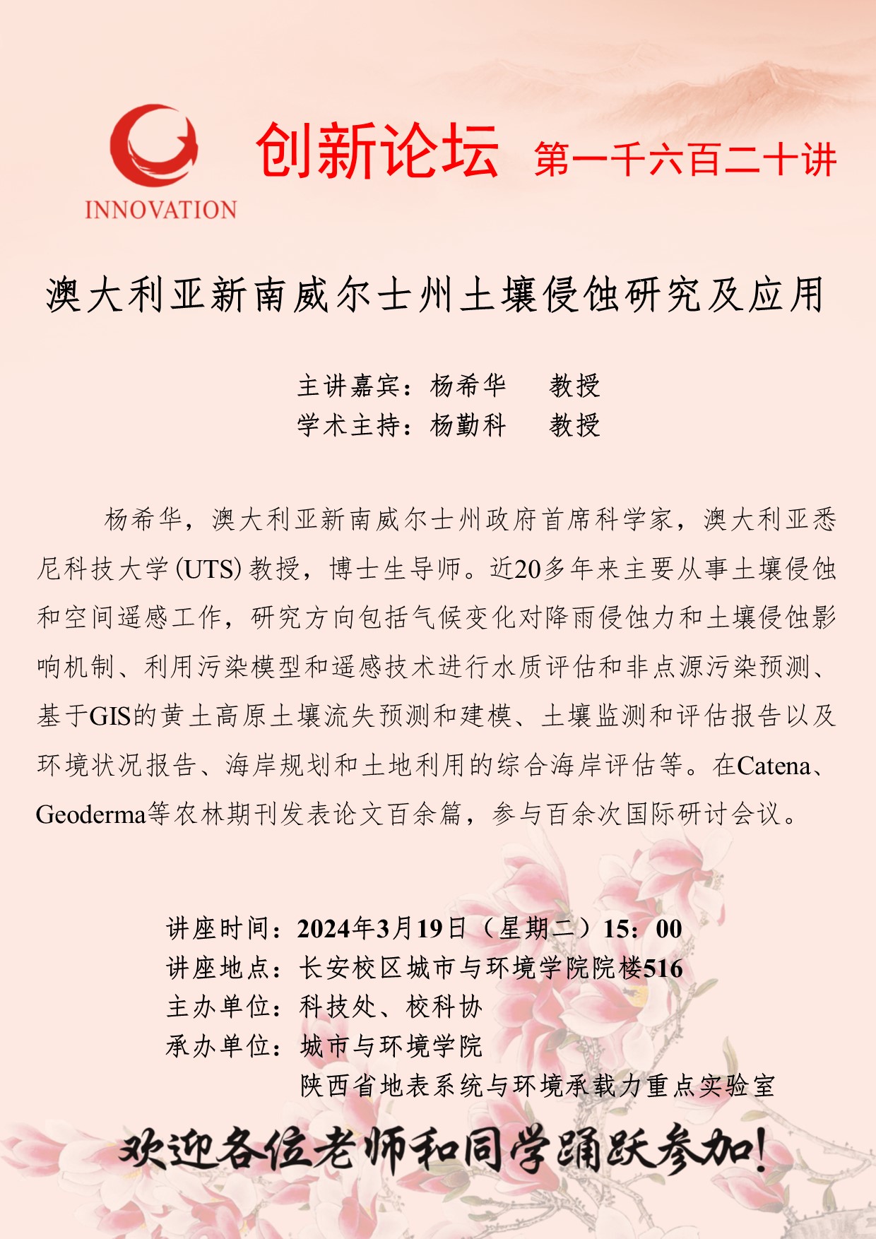 杨希华 教授 开云手机网页版登录入口创新论坛第一千六百二十讲:澳大利亚新南威尔士州土壤侵蚀研究及应用 讲座时间 2024年3月19日(星期二)15:00 讲座地点 长安校区城市与环境学院院楼516 讲座人介绍 杨希华 教授 讲座内容