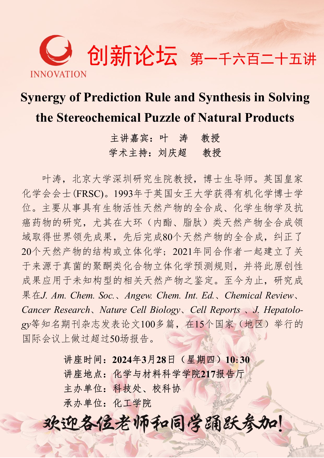 叶涛 教授 开云手机网页版登录入口创新论坛第一千六百二十五讲:Synergy of Prediction Rule and Synthesis in Solving the Stereochemical Puzzle of Natural Products 讲座时间 2024年3月28日(星期四)10:30 讲座地点 化学与材料科学学院217报告厅 讲座人介绍 叶涛 教授 讲座内容