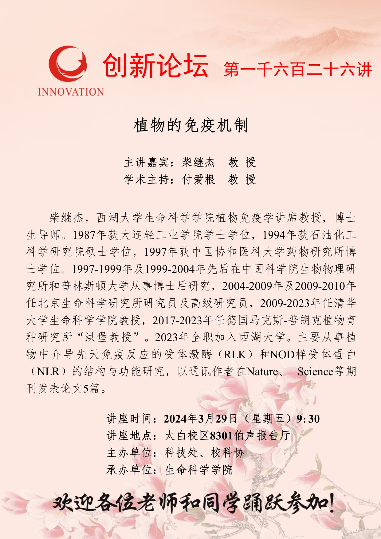 柴继杰 教授 开云手机网页版登录入口创新论坛第一千六百二十六讲:植物的免疫机制 讲座时间 2024年3月29日(星期五)09:30 讲座地点 太白校区8301伯声报告厅 讲座人介绍 柴继杰 教授 讲座内容