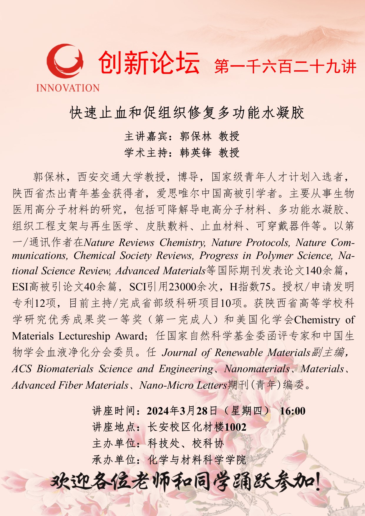 郭保林 教授 开云手机网页版登录入口创新论坛第一千六百二十九讲:快速止血和促组织修复多功能水凝胶 讲座时间 2024年3月28日(星期四) 16:00 讲座地点 长安校区化材楼1002 讲座人介绍 郭保林 教授 讲座内容
