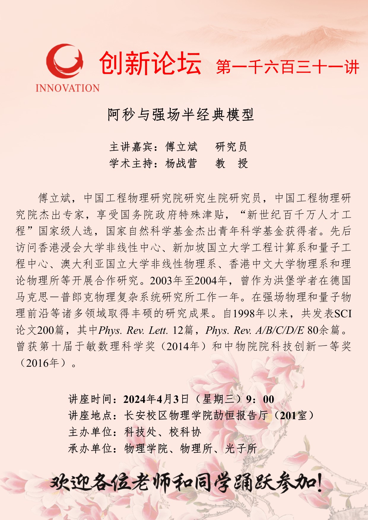 傅立斌 研究员 开云手机网页版登录入口创新论坛第一千六百三十一讲:阿秒与强场半经典模型 讲座时间 2024年4月3日(星期三)9:00 讲座地点 长安校区物理学院劼恒报告厅(201室) 讲座人介绍 傅立斌 研究员 讲座内容