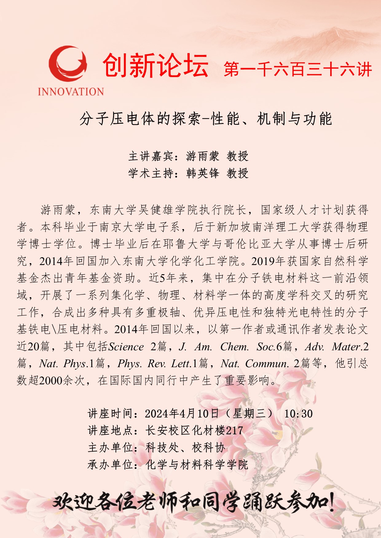 游雨蒙 教授 开云手机网页版登录入口创新论坛第一千六百三十六讲:分子压电体的探索-性能、机制与功能 讲座时间 2024年4月10日(星期三) 10:30 讲座地点 长安校区化材楼217 讲座人介绍 游雨蒙 教授 讲座内容