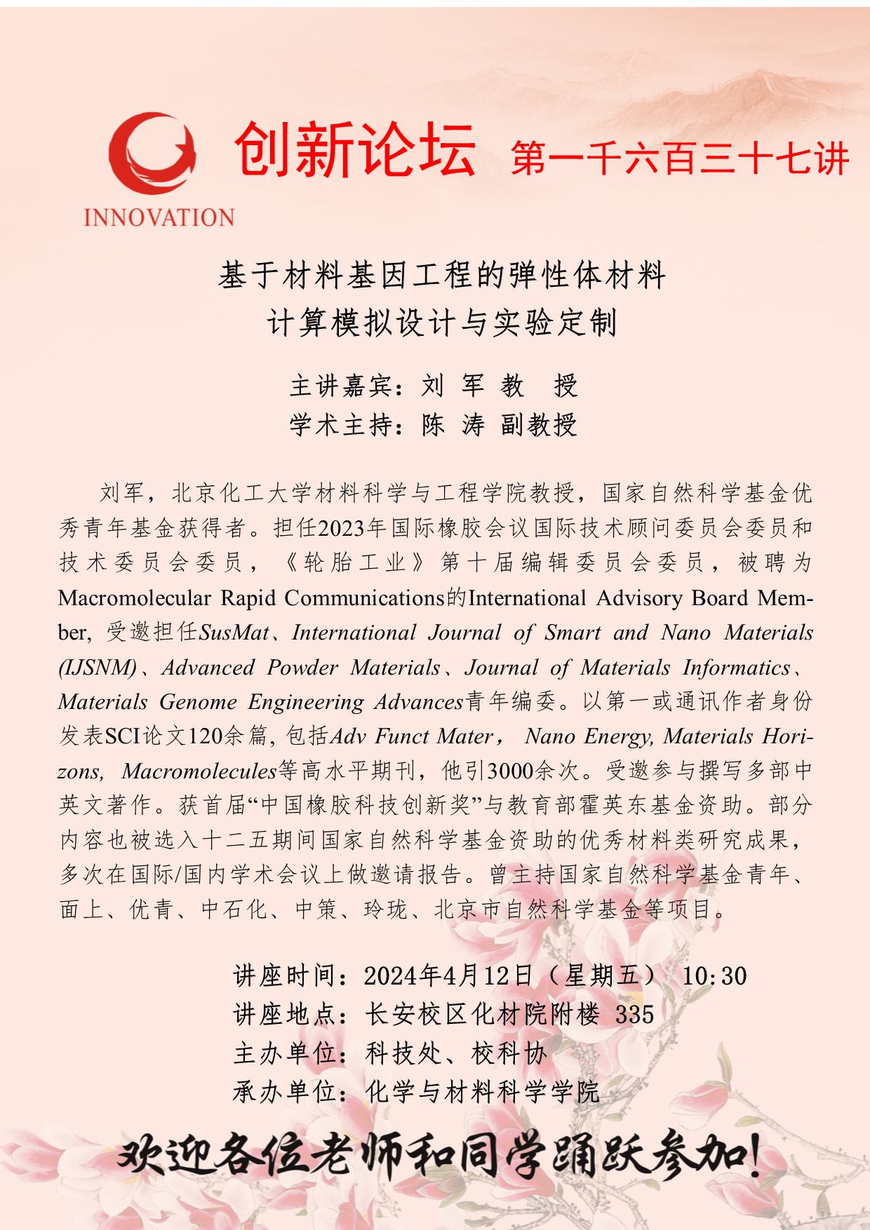 刘军 教授 开云手机网页版登录入口创新论坛第一千六百三十七讲:基于材料基因工程的弹性体材料计算模拟设计与实验定制 讲座时间 2024年4月12日(星期五) 10:30 讲座地点 长安校区化材院附楼335 讲座人介绍 刘军 教授 讲座内容