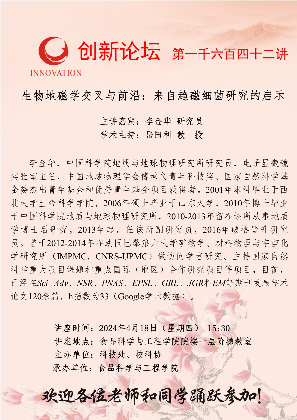 李金华 研究员 开云手机网页版登录入口创新论坛第一千六百四十二讲:生物地磁学交叉与前沿:来自趋磁细菌研究的启示 讲座时间 2024年4月18日(星期四) 15:30 讲座地点 食品科学与工程学院院楼一层阶梯教室 讲座人介绍 李金华 研究员 讲座内容