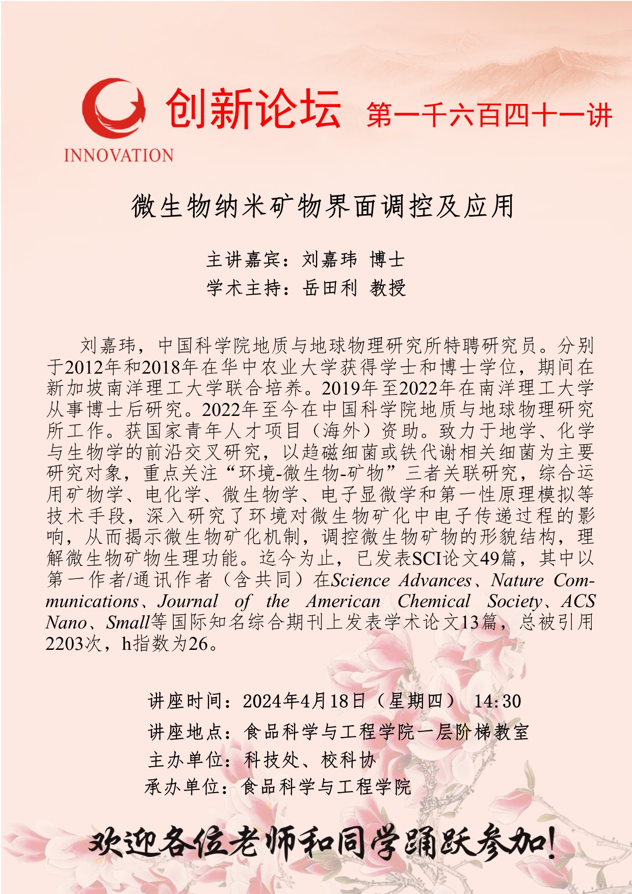 刘嘉玮 博士 开云手机网页版登录入口创新论坛第一千六百四十一讲:微生物纳米矿物界面调控及应用 讲座时间 2024年4月18日(星期四) 14:30 讲座地点 食品科学与工程学院一层阶梯教室 讲座人介绍 刘嘉玮 博士 讲座内容
