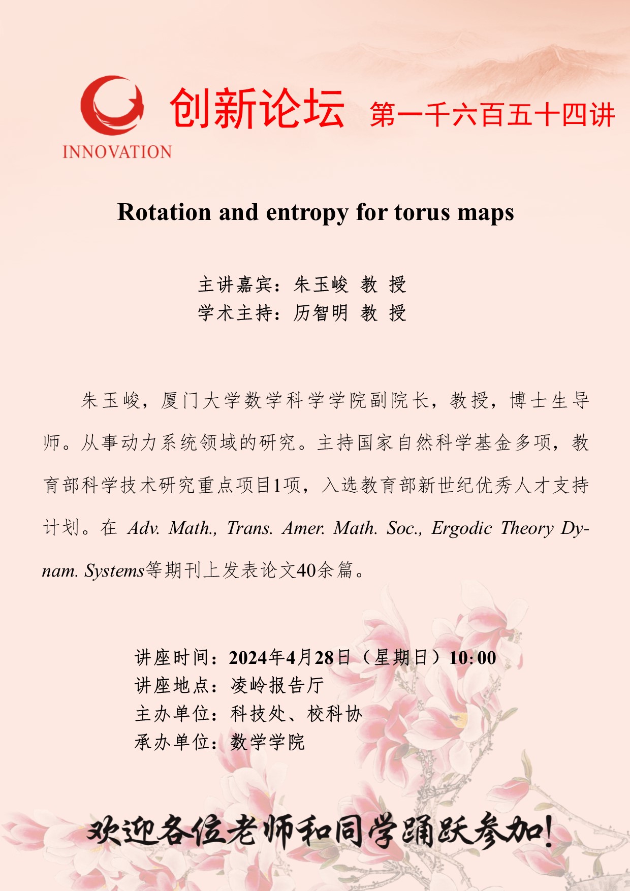 朱玉峻 教授 开云手机网页版登录入口创新论坛第一千六百五十四讲:Rotation and entropy for torus maps 讲座时间 2024年4月28日(星期日)10:00 讲座地点 凌岭报告厅 讲座人介绍 朱玉峻 教授 讲座内容