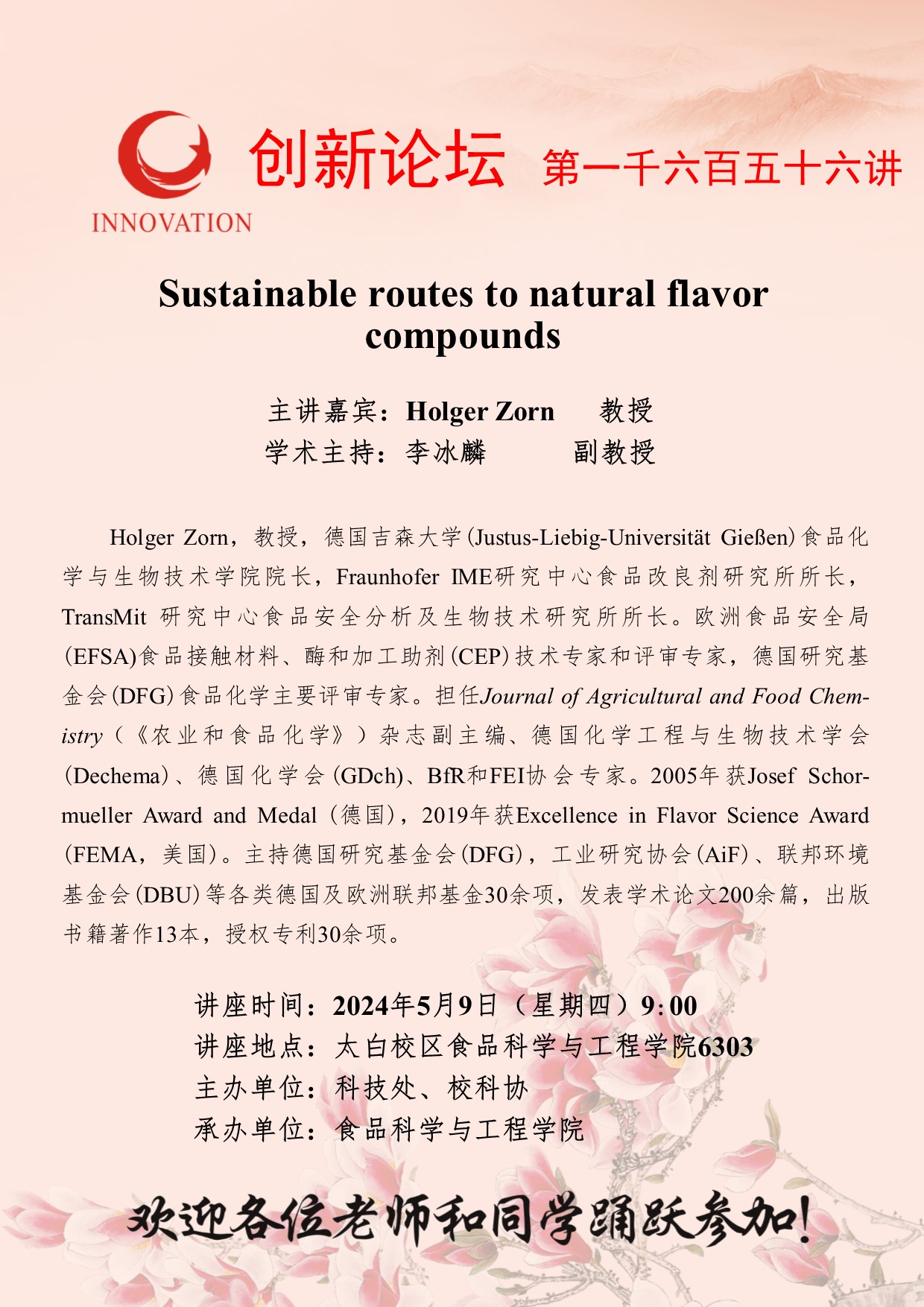 Holger Zorn 教授 开云手机网页版登录入口创新论坛第一千六百五十六讲:Sustainable routes to natural flavor compounds 讲座时间 2024年5月9日(星期四)9:00 讲座地点 太白校区食品科学与工程学院6303 讲座人介绍 Holger Zorn 教授 讲座内容