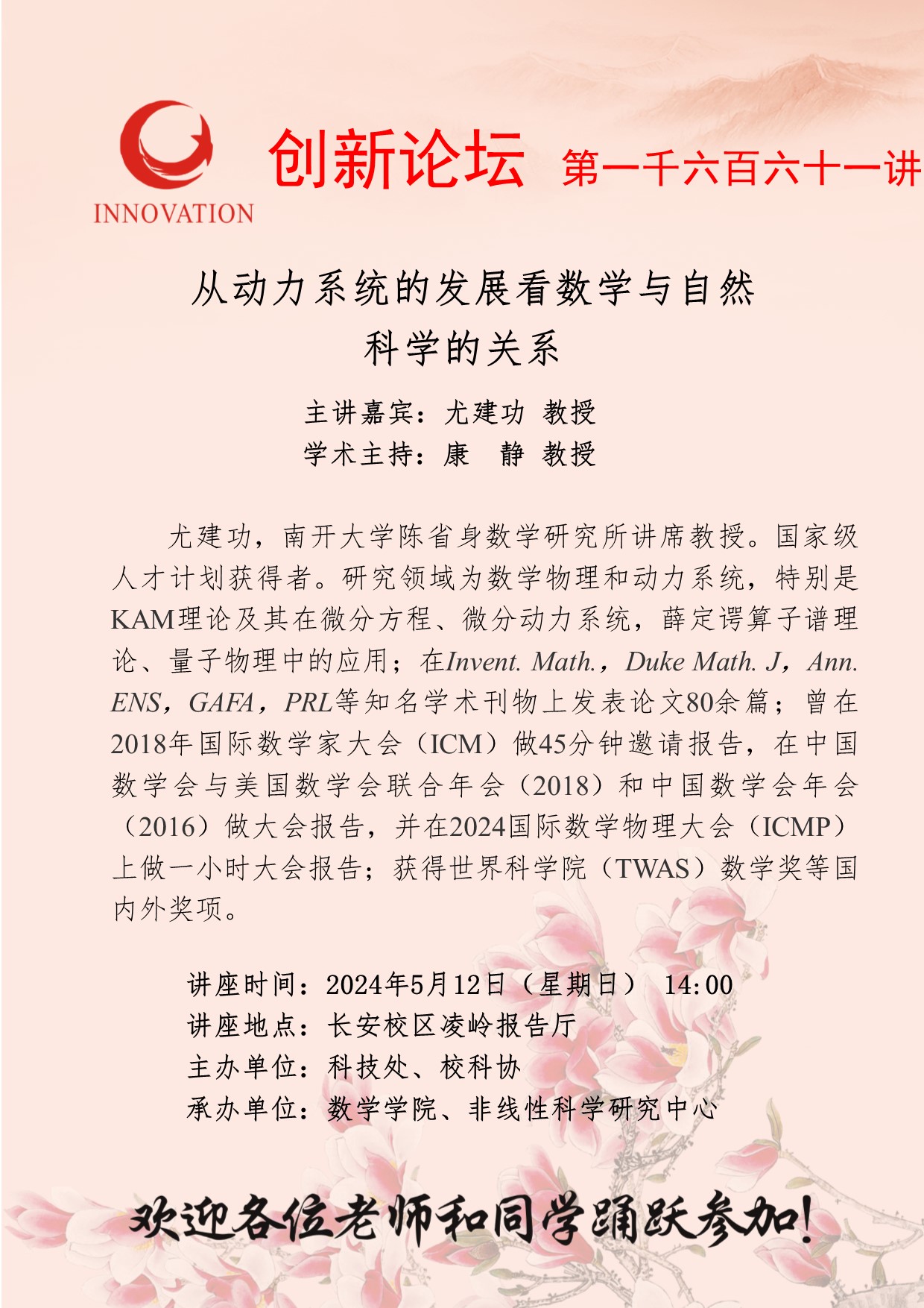 尤建功 教授 开云手机网页版登录入口创新论坛第一千六百六十一讲:从动力系统的发展看数学与自然科学的关系 讲座时间 2024年5月12日(星期日) 14:00 讲座地点 长安校区凌岭报告厅 讲座人介绍 尤建功 教授 讲座内容