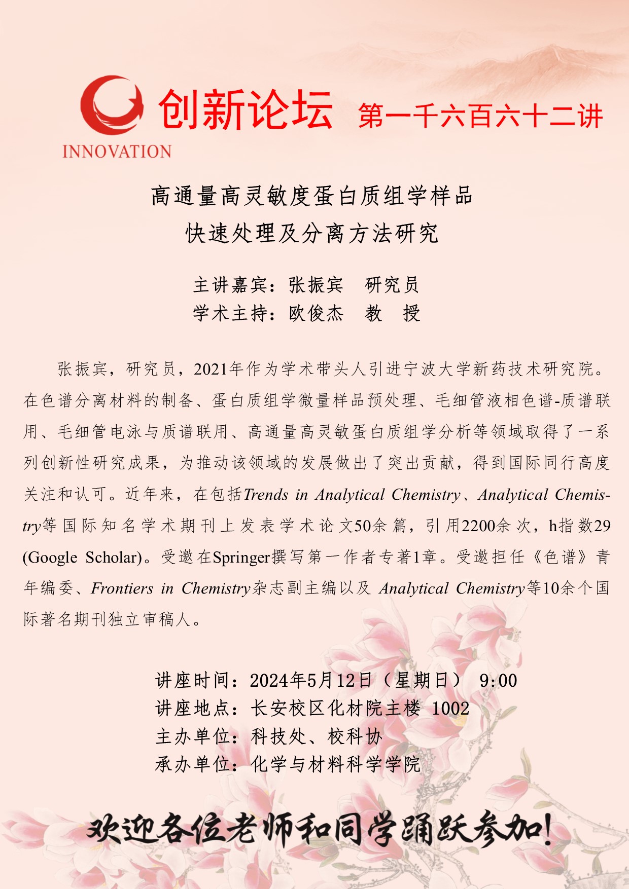 张振宾 研究员 开云手机网页版登录入口创新论坛第一千六百六十二讲:高通量高灵敏度蛋白质组学样品快速处理及分离方法研究 讲座时间 2024年5月12日(星期日) 9:00 讲座地点 长安校区化材院主楼 讲座人介绍 张振宾 研究员 讲座内容