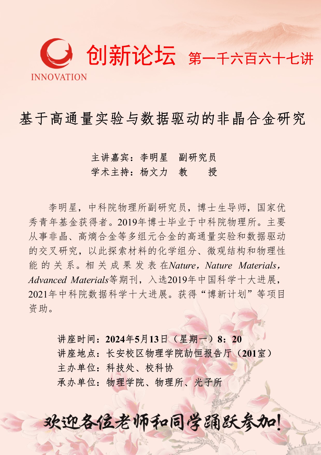 李明星 副研究员 开云手机网页版登录入口创新论坛第一千六百六十七讲:基于高通量实验与数据驱动的非晶合金研究 讲座时间 2024年5月13日(星期一)8:20 讲座地点 长安校区物理学院劼恒报告厅(201室) 讲座人介绍 李明星 副研究员 讲座内容
