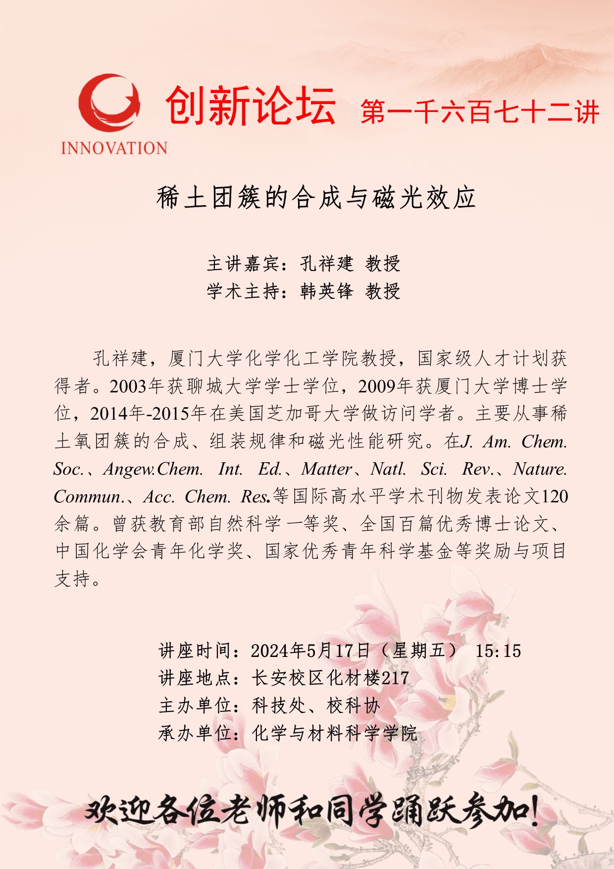 孔祥建 教授 开云手机网页版登录入口创新论坛第一千六百七十二讲:稀土团簇的合成与磁光效应 讲座时间 2024年5月17日(星期五) 15:15 讲座地点 长安校区化材楼217 讲座人介绍 孔祥建 教授 讲座内容