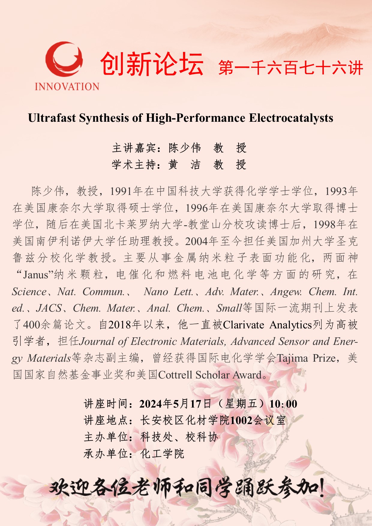 陈少伟 教授 开云手机网页版登录入口创新论坛第一千六百七十七讲:Ultrafast Synthesis of High-Performance Electrocatalysts 讲座时间 2024年5月17日(星期五)10:00 讲座地点 长安校区化材学院1002会议室 讲座人介绍 陈少伟 教授 讲座内容