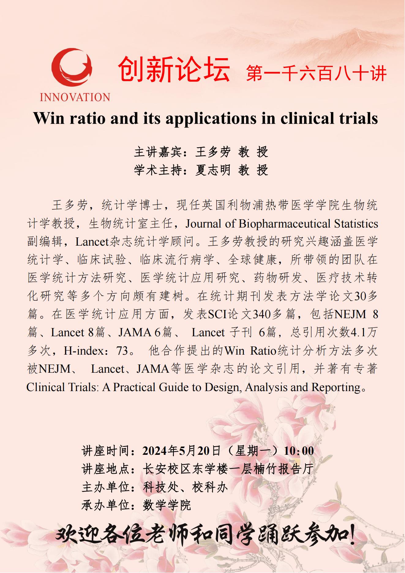 王多劳 教授 开云手机网页版登录入口创新论坛第一千六百八十讲:Win ratio and its applications in clinical trials 讲座时间 2024年5月20日(星期一) 10:00 讲座地点 长安校区东学楼一层楠竹报告厅 讲座人介绍 王多劳 教授 讲座内容