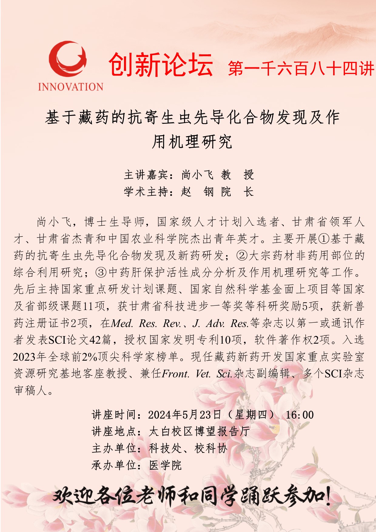 尚小飞 教授 开云手机网页版登录入口创新论坛第一千六百八十四讲:基于藏药的抗寄生虫先导化合物发现及作用机理研究 讲座时间 2024年5月23日(星期四) 16:00 讲座地点 太白校区博望报告厅 讲座人介绍 尚小飞 教授 讲座内容