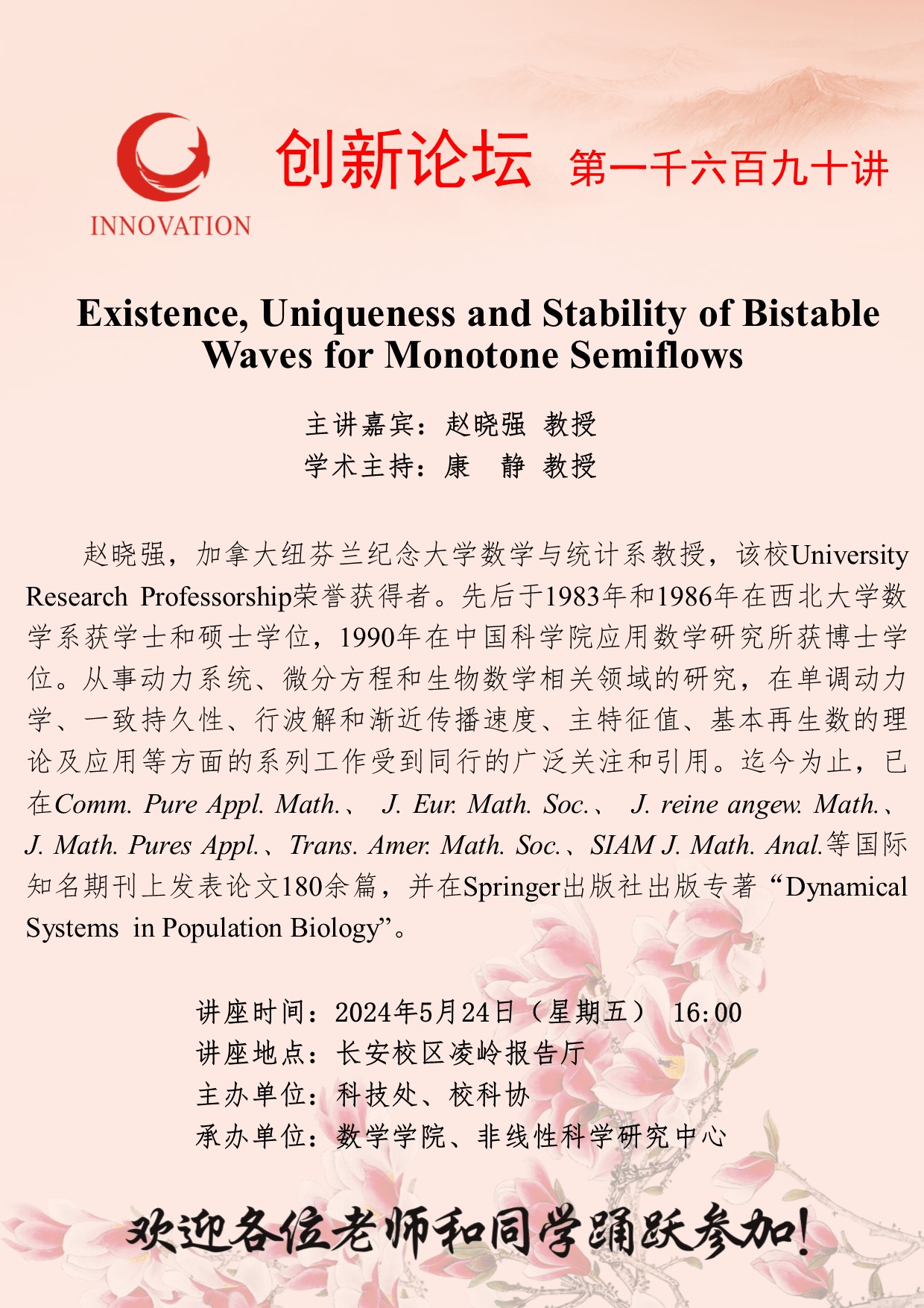 赵晓强 教授 开云手机网页版登录入口创新论坛第一千六百九十讲:Existence, Uniqueness and Stability of Bistable Waves for Monotone Semiflows 讲座时间 2024年5月24日(星期五) 16:00 讲座地点 长安校区凌岭报告厅 讲座人介绍 赵晓强 教授 讲座内容