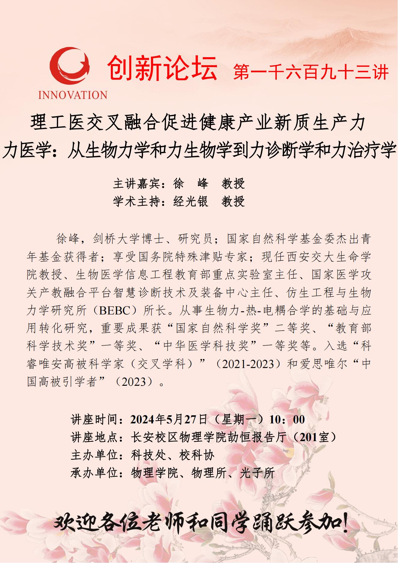 徐峰 教授 开云手机网页版登录入口创新论坛第一千六百九十三讲:理工医交叉融合促进健康产业新质生产力——力医学:从生物力学和力生物学到力诊断学和力治疗学 讲座时间 2024年5月27日(星期一)10:00 讲座地点 长安校区物理学院劼恒报告厅(201室) 讲座人介绍 徐峰 教授 讲座内容