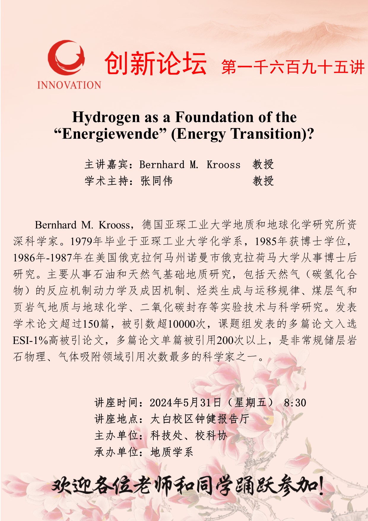 Bernhard M. Krooss 教授 开云手机网页版登录入口创新论坛第一千六百九十五讲:Hydrogen as a Foundation of the “Energiewende” (Energy Transition)? 讲座时间 2024年5月31日(星期五) 8:30 讲座地点 太白校区钟健报告厅 讲座人介绍 Bernhard M. Krooss 教授 讲座内容