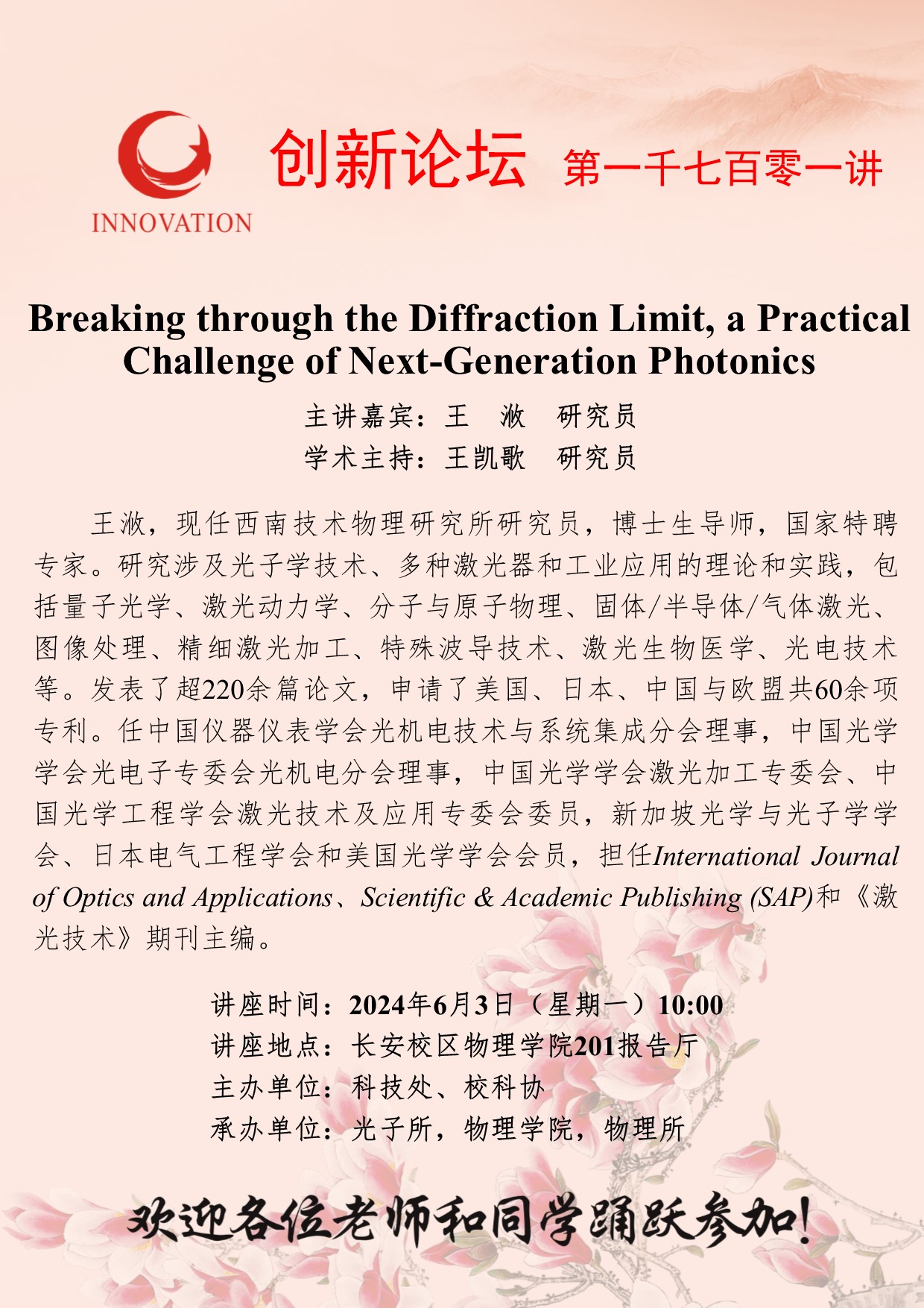 王浟 研究员 开云手机网页版登录入口创新论坛第一千七百零一讲:Breaking through the Diffraction Limit, a Practical Challenge of Next-Generation Photonics 讲座时间 2024年6月3日(星期一)10:00 讲座地点 长安校区物理学院201报告厅 讲座人介绍 王浟 研究员 讲座内容