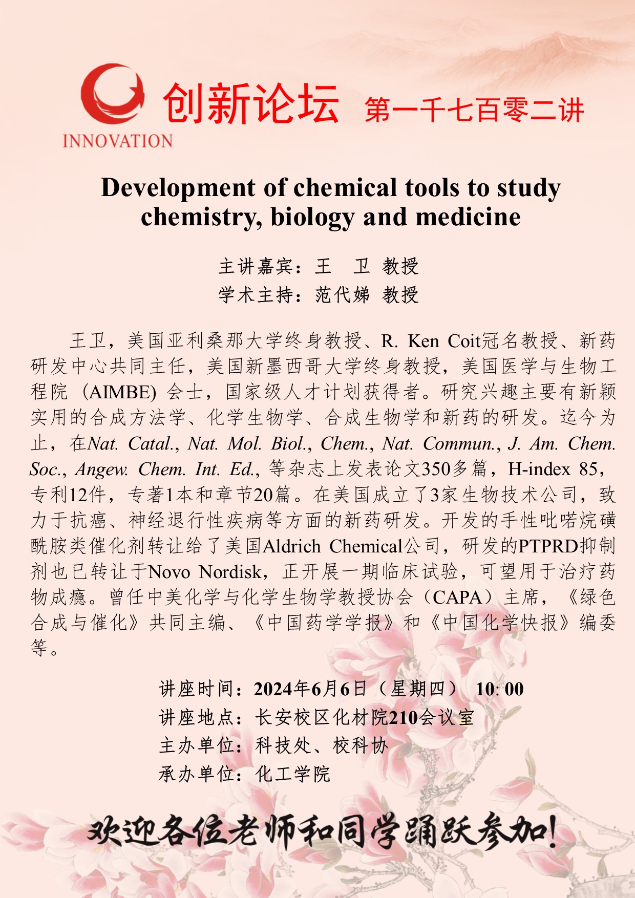王卫 教授 开云手机网页版登录入口创新论坛第一千七百零二讲:Development of chemical tools to study chemistry, biology and medicine 讲座时间 2024年6月6日(星期四) 10: 00 讲座地点 长安校区化材院210会议室 讲座人介绍 王卫 教授 讲座内容
