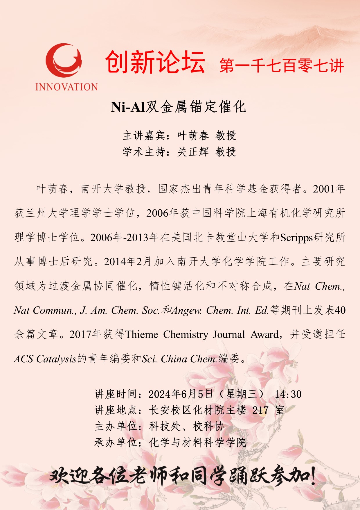 叶萌春 教授 开云手机网页版登录入口创新论坛第一千七百零七讲:Ni-Al双金属锚定催化 讲座时间 2024年6月5日(星期三) 14:30 讲座地点 长安校区化材院主楼 217 室 讲座人介绍 叶萌春 教授 讲座内容