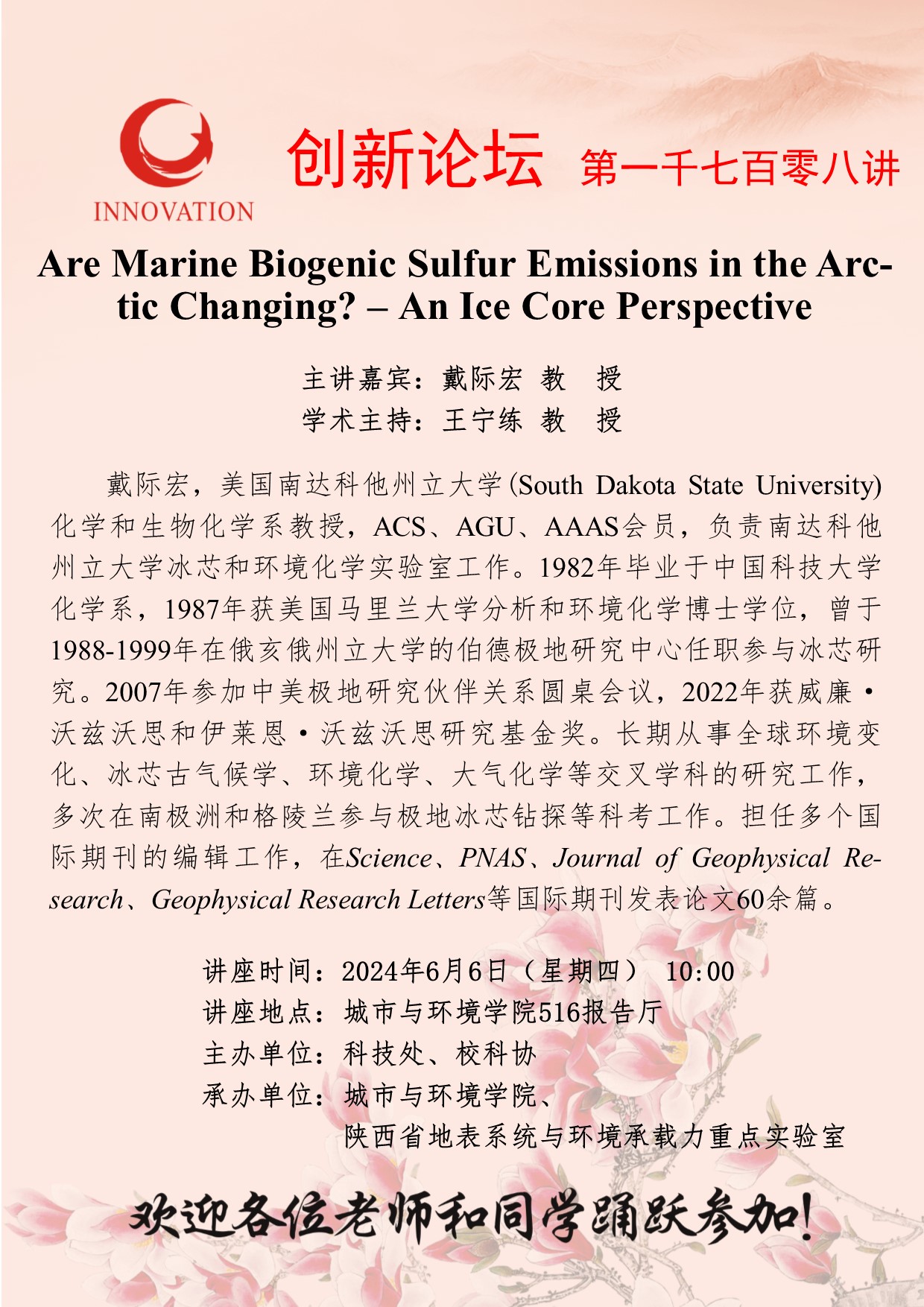 戴际宏 教授 开云手机网页版登录入口创新论坛第一千七百零八讲:Are Marine Biogenic Sulfur Emissions in the Arctic Changing? – An Ice Core Perspective 讲座时间 2024年6月6日(星期四) 10:00 讲座地点 城市与环境学院516报告厅 讲座人介绍 戴际宏 教授 讲座内容