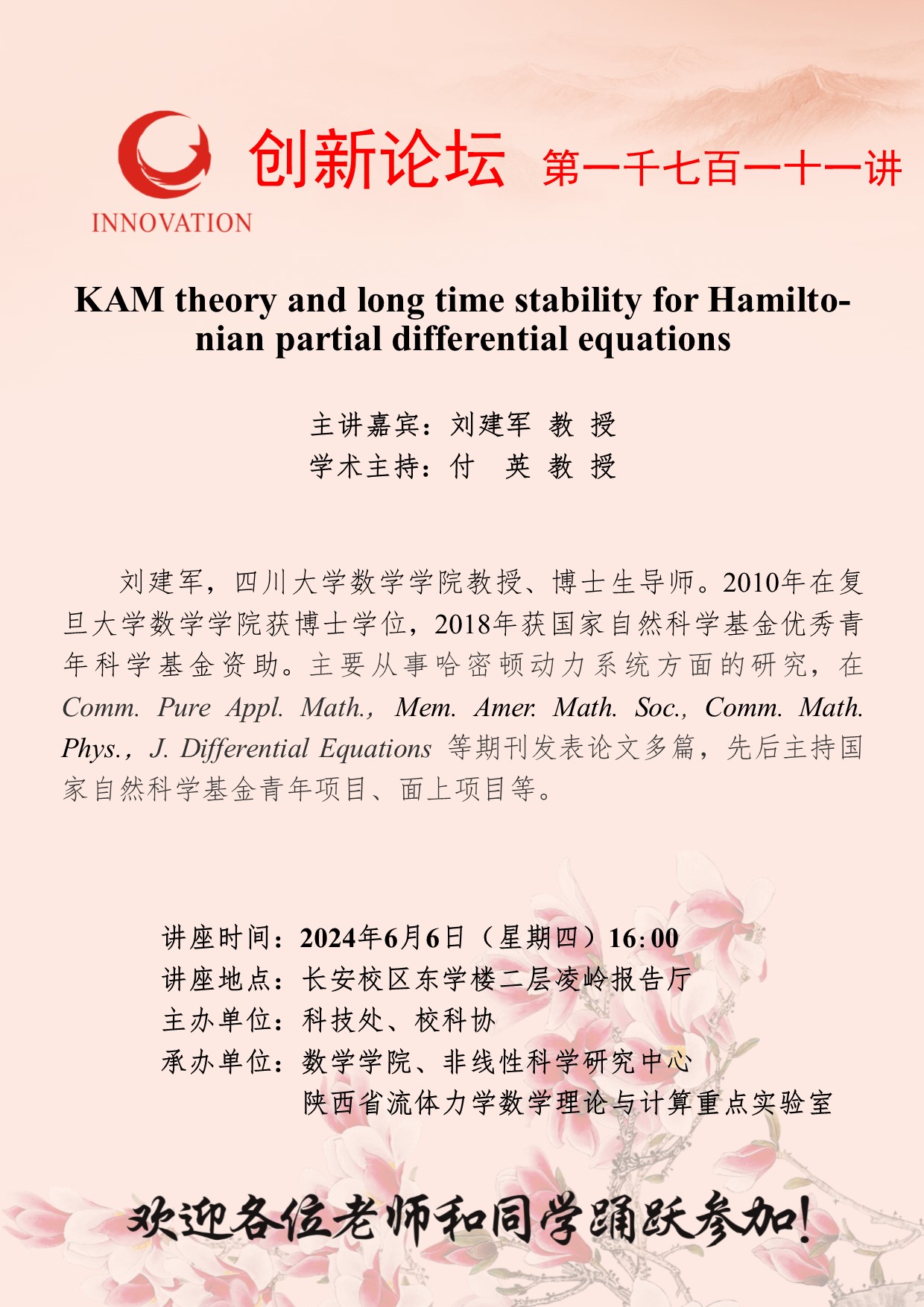 刘建军 教授 开云手机网页版登录入口创新论坛第一千七百一十一讲:KAM theory and long time stability for Hamiltonian partial differential equations 讲座时间 2024年6月6日(星期四)16:00 讲座地点 长安校区东学楼二层凌岭报告厅 讲座人介绍 刘建军 教授 讲座内容