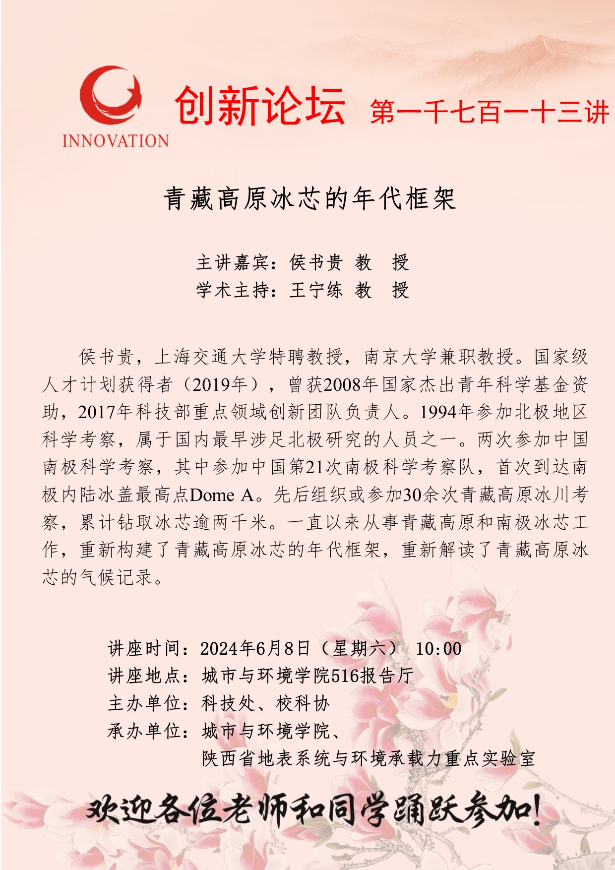 侯书贵 教授 开云手机网页版登录入口创新论坛第一千七百一十三讲:青藏高原冰芯的年代框架 讲座时间 2024年6月8日(星期六) 10:00 讲座地点 城市与环境学院516报告厅 讲座人介绍 侯书贵 教授 讲座内容