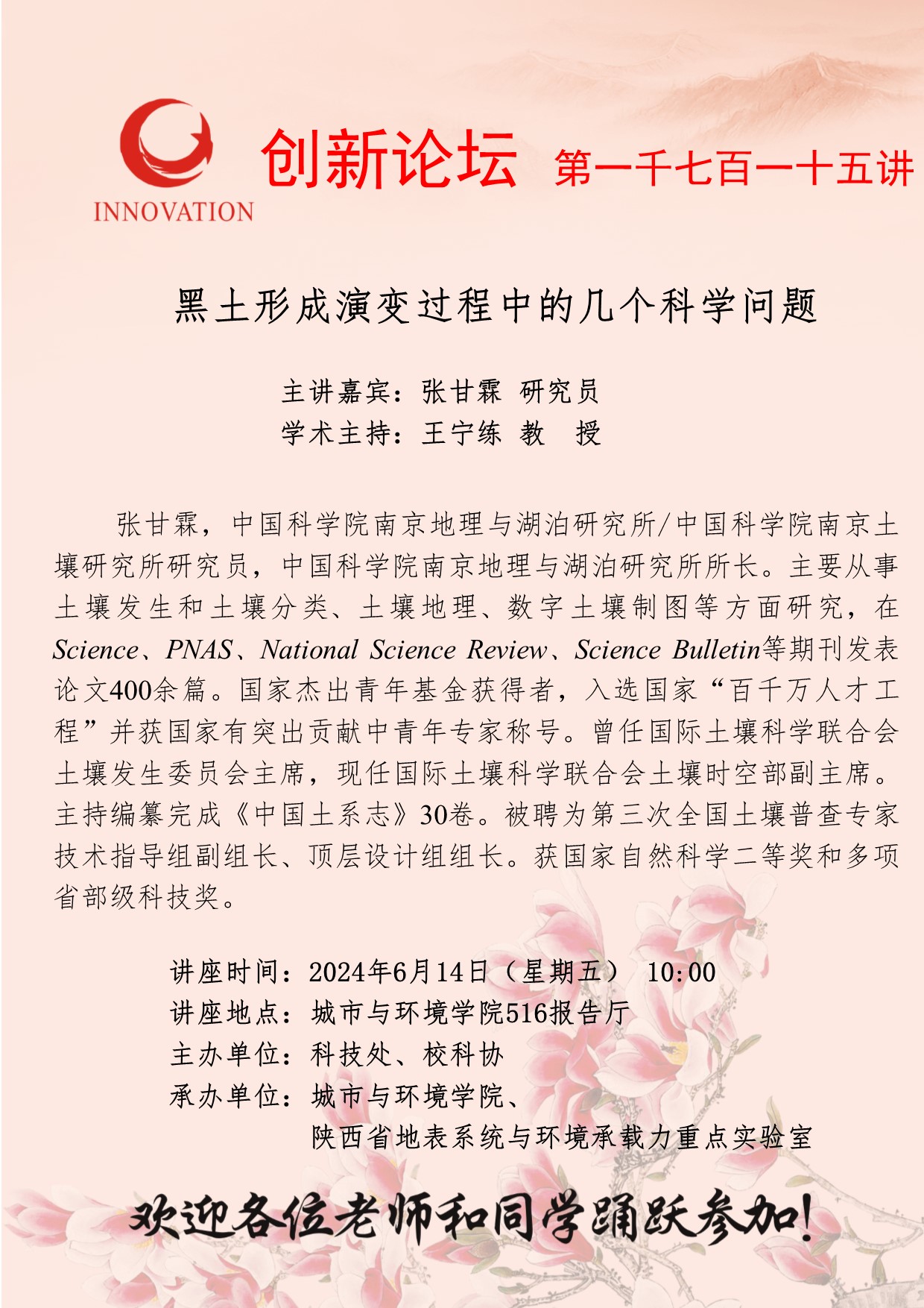 张甘霖 研究员 开云手机网页版登录入口创新论坛第一千七百一十五讲:黑土形成演变过程中的几个科学问题 讲座时间 2024年6月14日(星期五) 10:00 讲座地点 城市与环境学院516报告厅 讲座人介绍 张甘霖 研究员 讲座内容