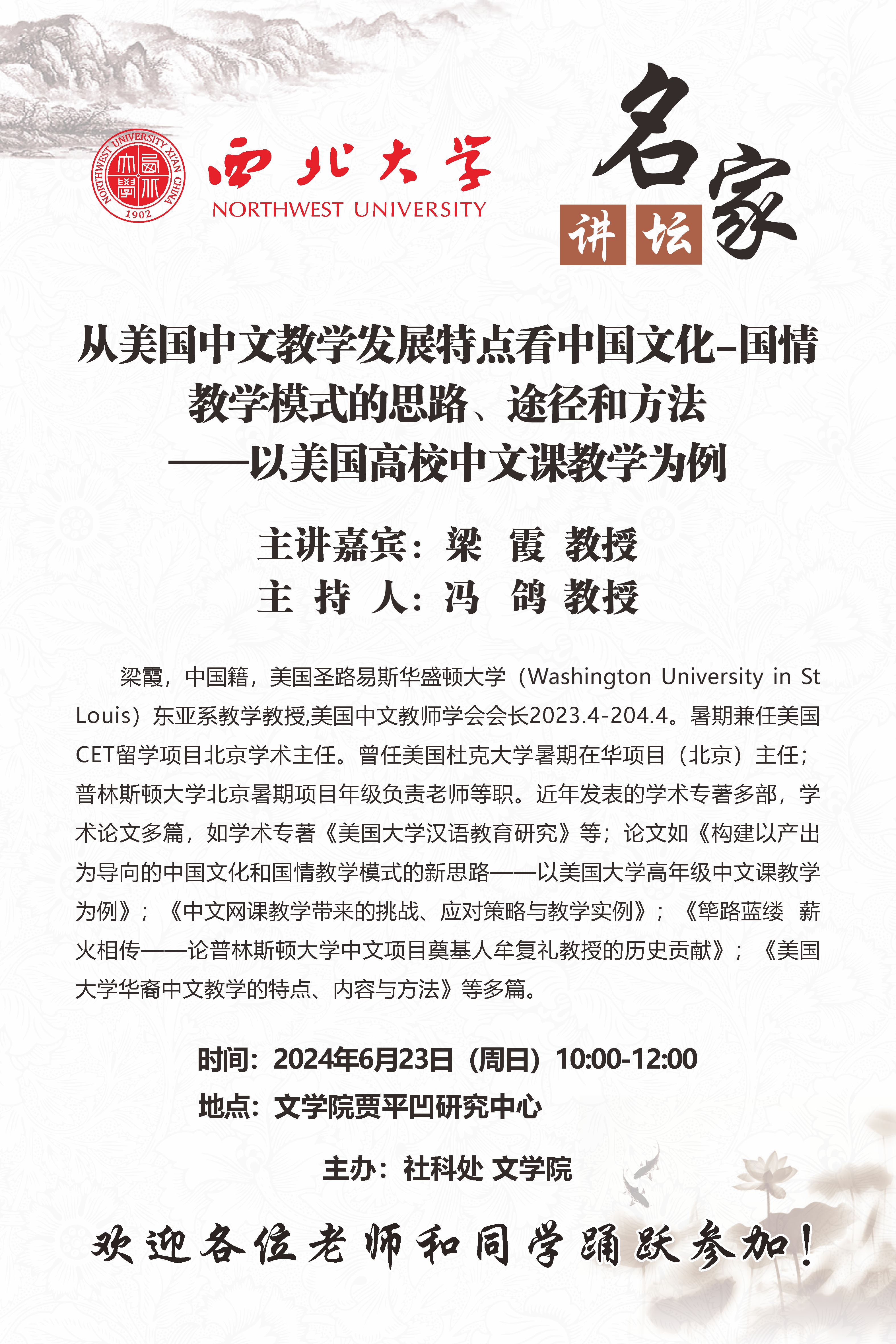 梁霞 教授 名家讲坛:从美国中文教学发展特点看中国文化-国情教学模式的思路、途径和方法——以美国高校中文课教学为例 讲座时间 2024年6月23日(周日)上午10:00 讲座地点 文学院贾平凹研究中心 讲座人介绍 梁霞 教授 讲座内容