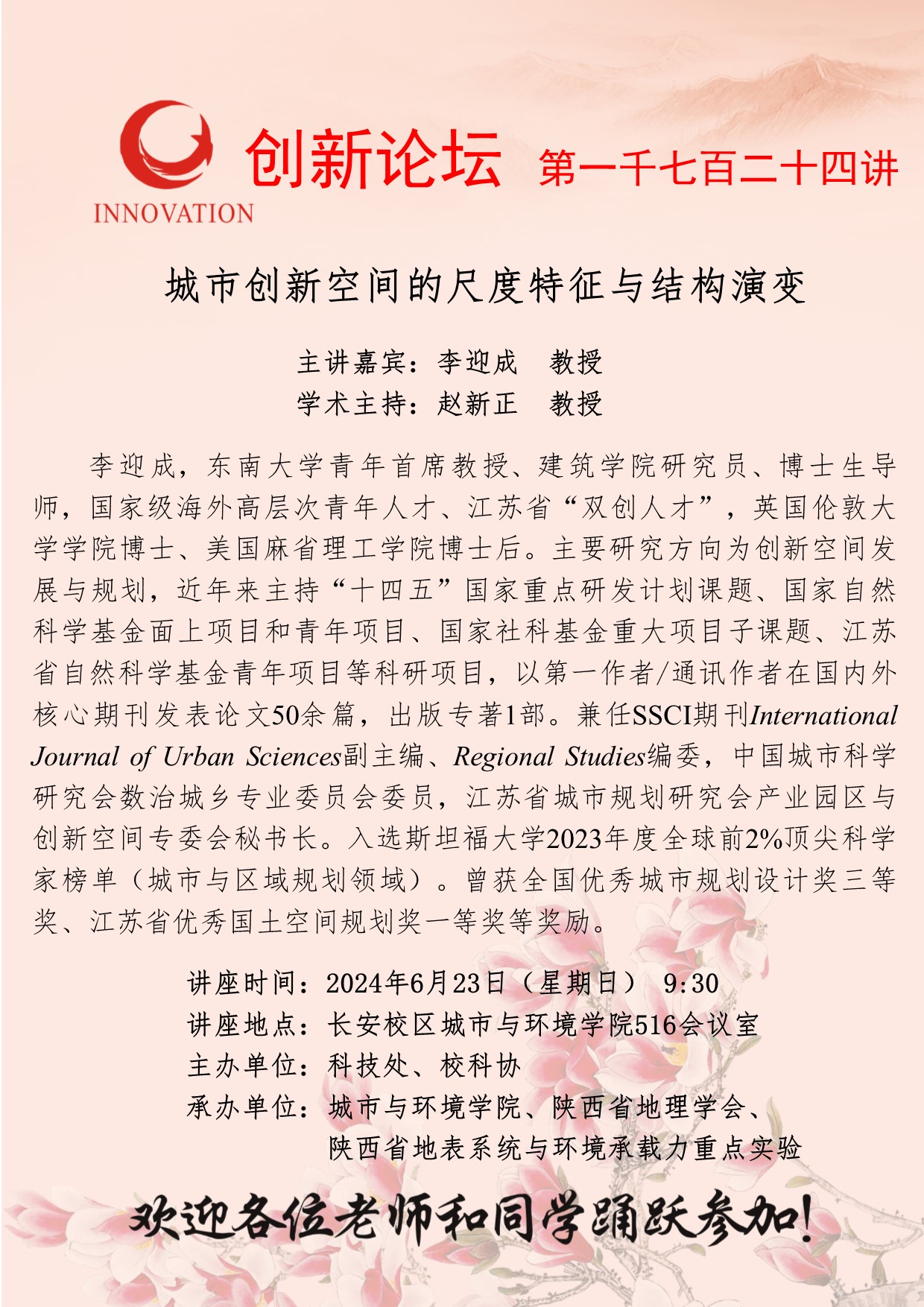 李迎成 教授 开云手机网页版登录入口创新论坛第一千七百二十四讲:城市创新空间的尺度特征与结构演变 讲座时间 2024年6月23日(星期日) 9:30 讲座地点 长安校区城市与环境学院516会议室 讲座人介绍 李迎成 教授 讲座内容