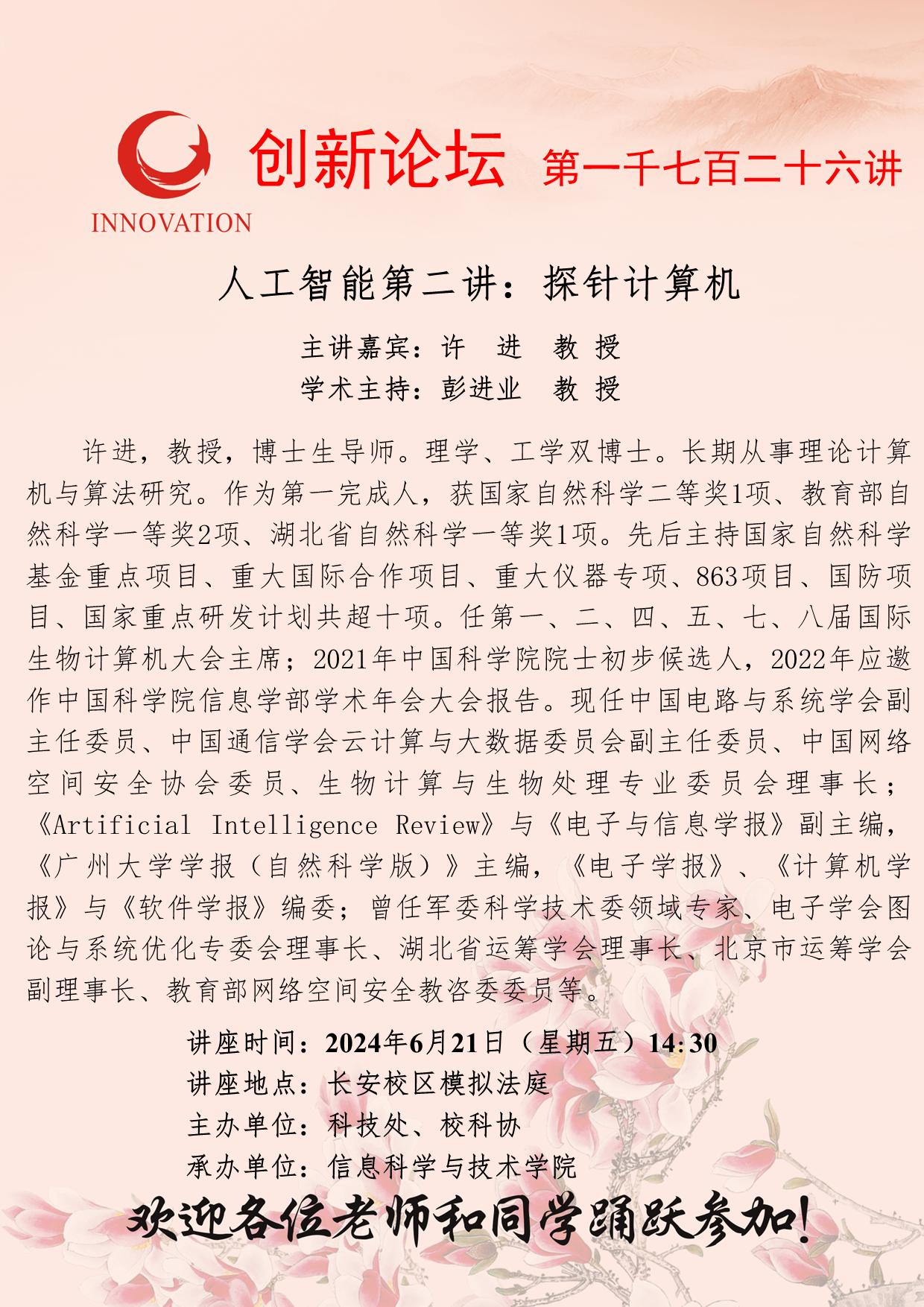 许进 教授 开云手机网页版登录入口创新论坛第一千七百二十六讲:人工智能第二讲:探针计算机 讲座时间 2024年6月21日(星期五)14:30 讲座地点 长安校区模拟法庭 讲座人介绍 许进 教授 讲座内容