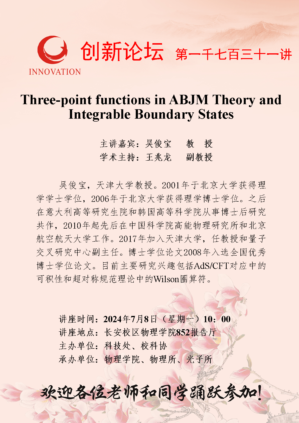 吴俊宝 教授 开云手机网页版登录入口创新论坛第一千七百三十一讲:Three-point functions in ABJM Theory and Integrable Boundary States 讲座时间 2024年7月8日(星期一)10:00 讲座地点 长安校区物理学院852报告厅 讲座人介绍 吴俊宝 教授 讲座内容