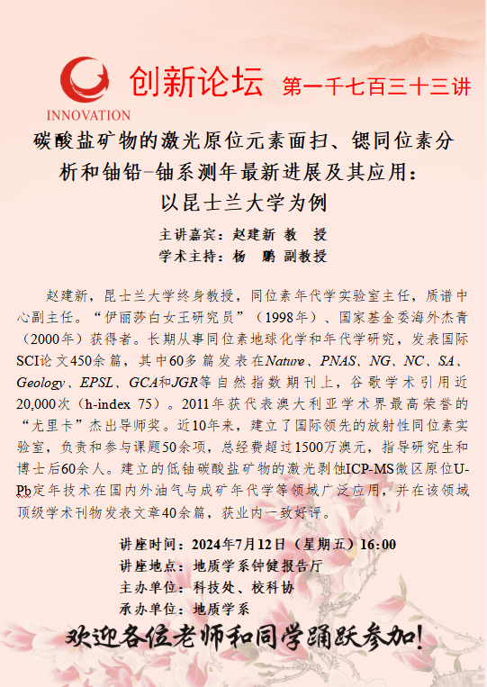 赵建新 教授 开云手机网页版登录入口创新论坛第一千七百三十三讲:碳酸盐矿物的激光原位元素面扫、锶同位素分析和铀铅-铀系测年最新进展及其应用:以昆士兰大学为例 讲座时间 2024年7月12日(星期五)16:00 讲座地点 地质学系钟健报告厅 讲座人介绍 赵建新 教授 讲座内容