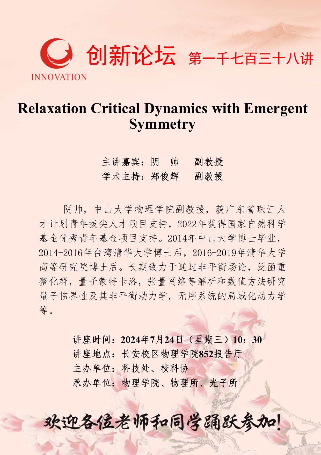 阴帅 副教授 开云手机网页版登录入口创新论坛第一千七百三十八讲:Relaxation Critical Dynamics with Emergent Symmetry 讲座时间 2024年7月24日(星期三)10:30 讲座地点 长安校区物理学院852报告厅 讲座人介绍 阴帅 副教授 讲座内容