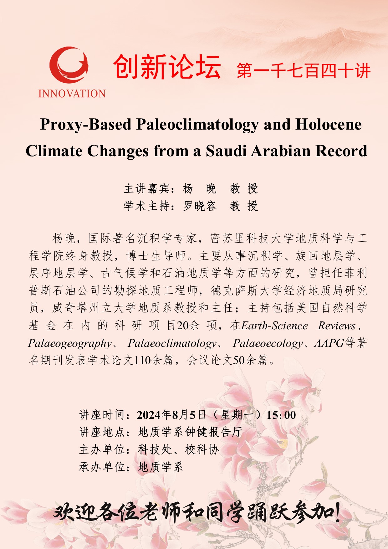杨晚 教授 开云手机网页版登录入口创新论坛第一千七百四十讲: Proxy-Based Paleoclimatology and Holocene Climate Changes from a Saudi Arabian Record 讲座时间 2024年8月5日(星期一)15:00 讲座地点 地质学系钟健报告厅 讲座人介绍 杨晚 教授 讲座内容