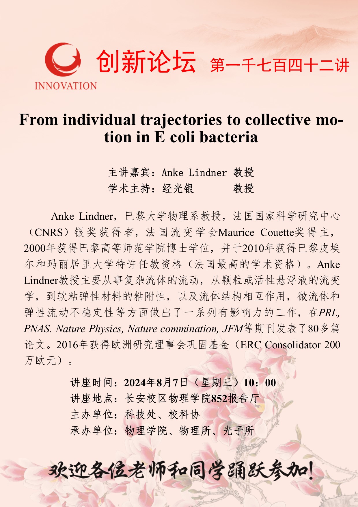 Anke Lindner 教授 开云手机网页版登录入口创新论坛第一千七百四十二讲:From individual trajectories to collective motion in E coli bacteria 讲座时间 2024年8月7日(星期三)10:00 讲座地点 长安校区物理学院852报告厅 讲座人介绍 Anke Lindner 教授 讲座内容
