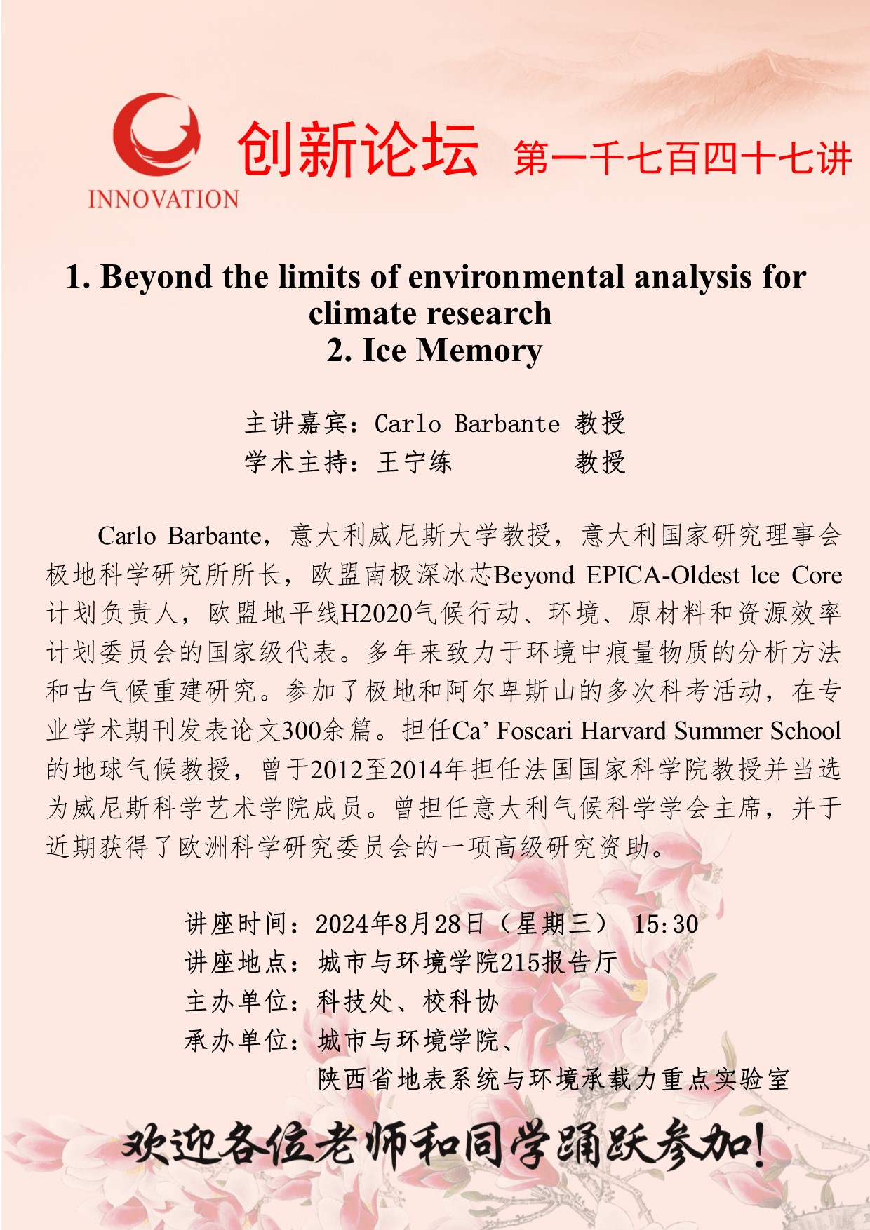 Carlo Barbante 教授 开云手机网页版登录入口创新论坛第一千七百四十七讲:1. Beyond the limits of environmental analysis for climate research 2. Ice Memory 讲座时间 2024年8月28日(星期三) 15:30 讲座地点 城市与环境学院215报告厅 讲座人介绍 Carlo Barbante 教授 讲座内容