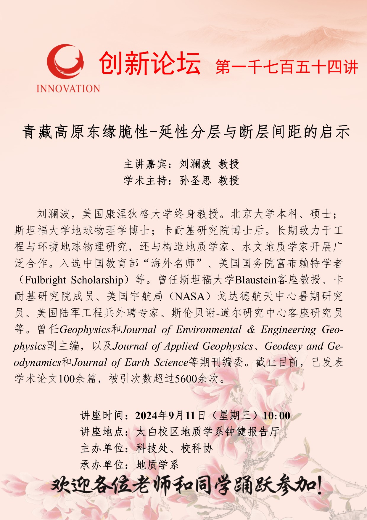 刘澜波 教授 开云手机网页版登录入口创新论坛第一千七百五十四讲:青藏高原东缘脆性-延性分层与断层间距的启示 讲座时间 2024年9月11日(星期三)10:00 讲座地点 太白校区地质学系钟健报告厅 讲座人介绍 刘澜波 教授 讲座内容
