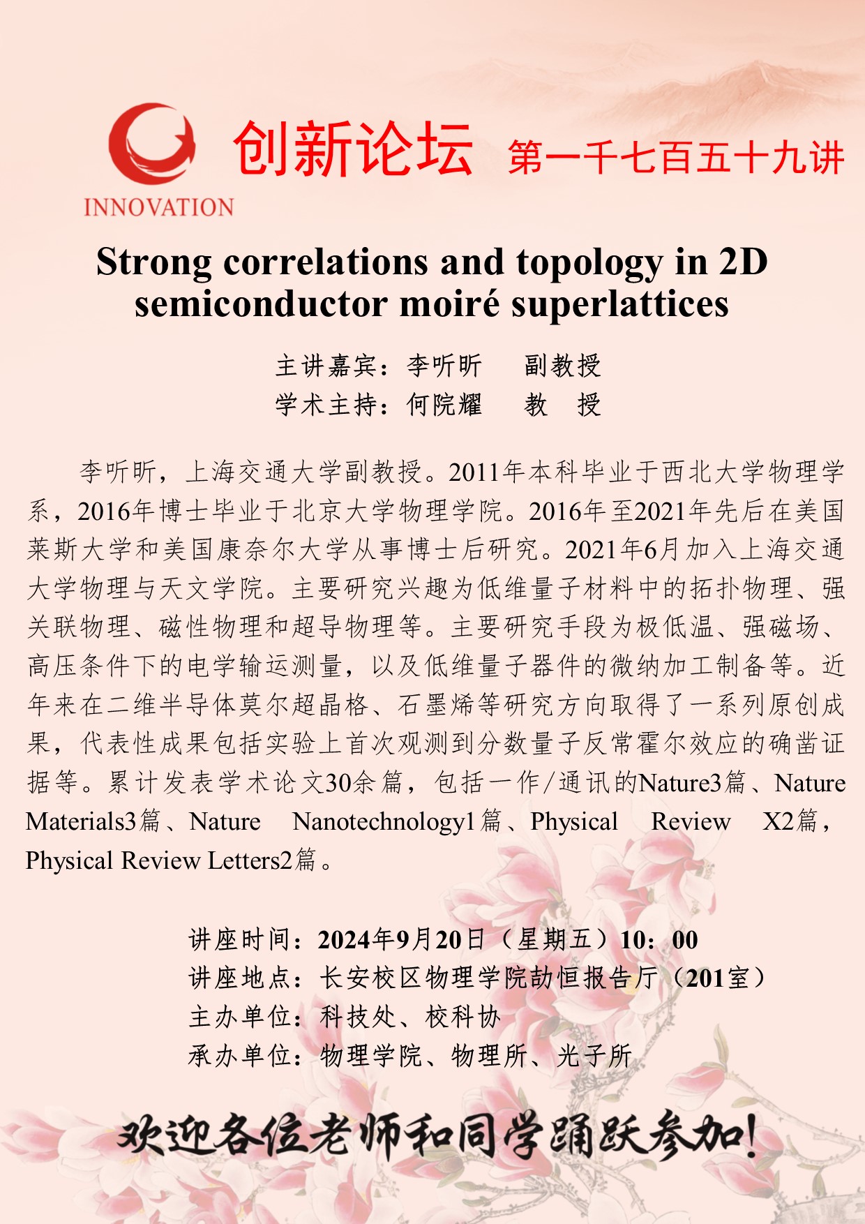 李听昕 副教授 开云手机网页版登录入口创新论坛第一千七百五十九讲:Strong correlations and topology in 2D semiconductor moiré superlattices 讲座时间 2024年9月20日(星期五) 10:00 讲座地点 长安校区物理学院劼恒报告厅(201室) 讲座人介绍 李听昕 副教授 讲座内容