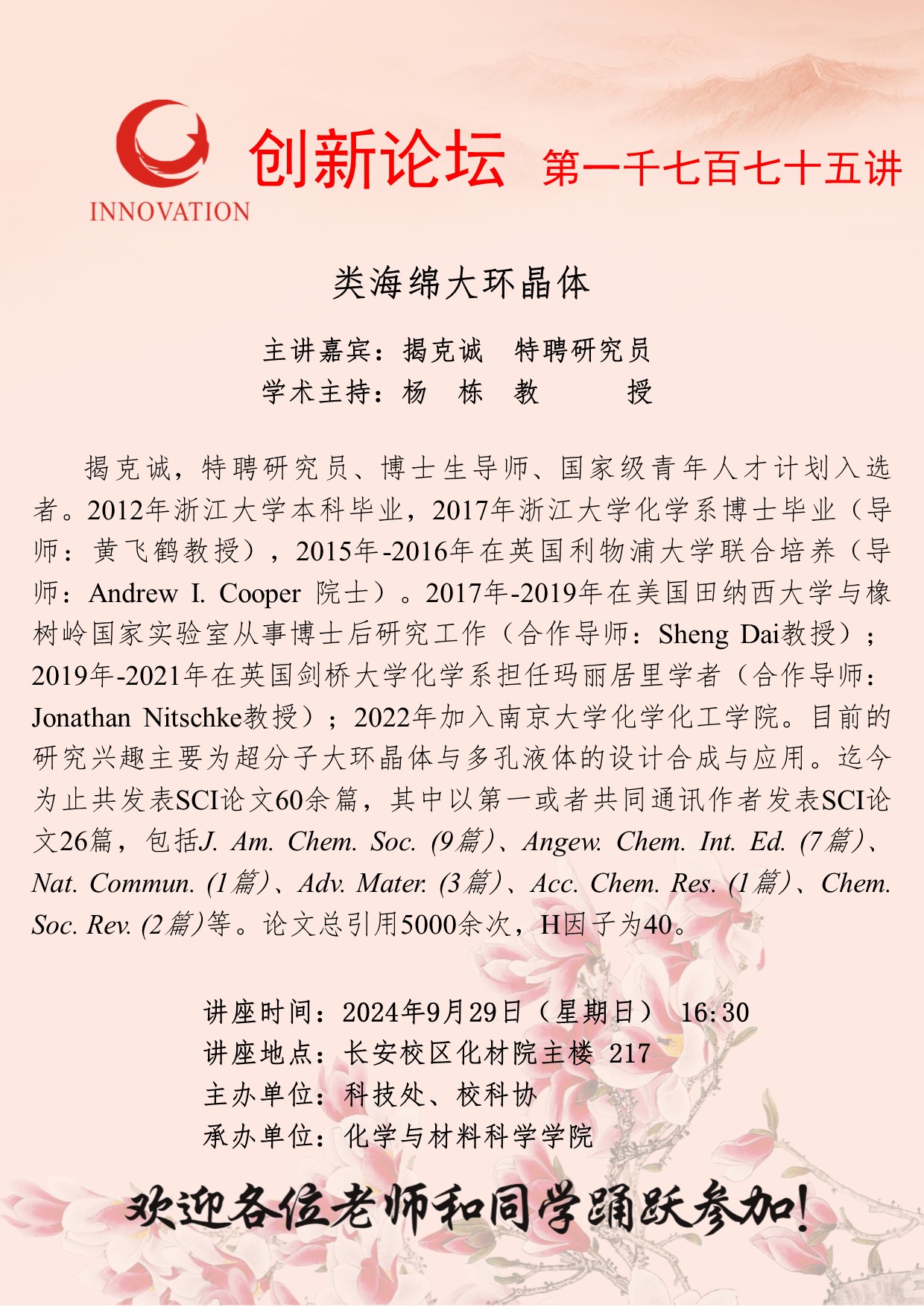 揭克诚 特聘研究员 开云手机网页版登录入口创新论坛第一千七百七十五讲:类海绵大环晶体 讲座时间 2024年9月29日(星期日) 16:30 讲座地点 长安校区化材院主楼 217 讲座人介绍 揭克诚 特聘研究员 讲座内容
