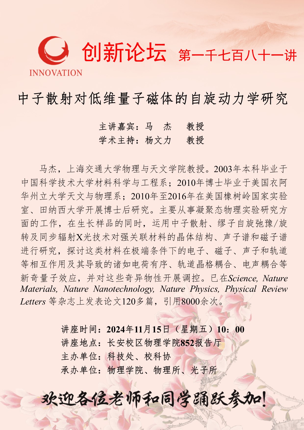 马杰 教授 开云手机网页版登录入口创新论坛第一千七百八十一讲:中子散射对低维量子磁体的自旋动力学研究 讲座时间 2024年11月15日(星期五)10:00 讲座地点 长安校区物理学院852报告厅 讲座人介绍 马杰 教授 讲座内容