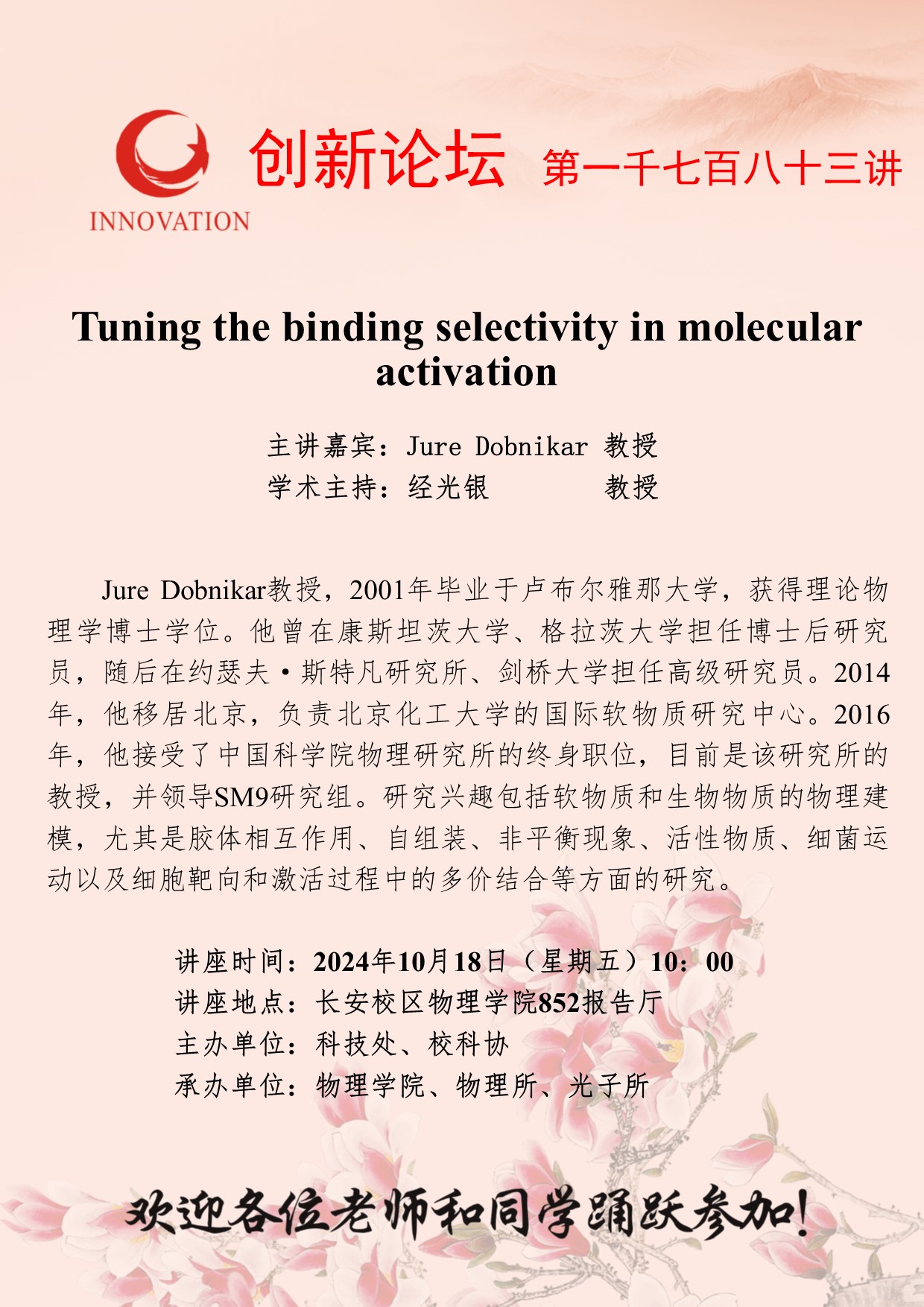 Jure Dobnikar 教授 开云手机网页版登录入口创新论坛第一千七百八十三讲:Tuning the binding selectivity in molecular activation 讲座时间 2024年10月18日(星期五)10:00 讲座地点 长安校区物理学院852报告厅 讲座人介绍 Jure Dobnikar 教授 讲座内容