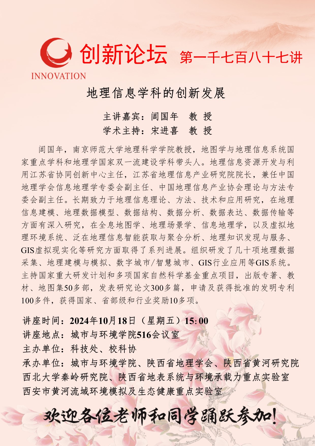 闾国年 教授 开云手机网页版登录入口创新论坛第一千七百八十七讲:地理信息学科的创新发展 讲座时间 2024年10月18日(星期五)15:00 讲座地点 城市与环境学院516会议室 讲座人介绍 闾国年 教授 讲座内容